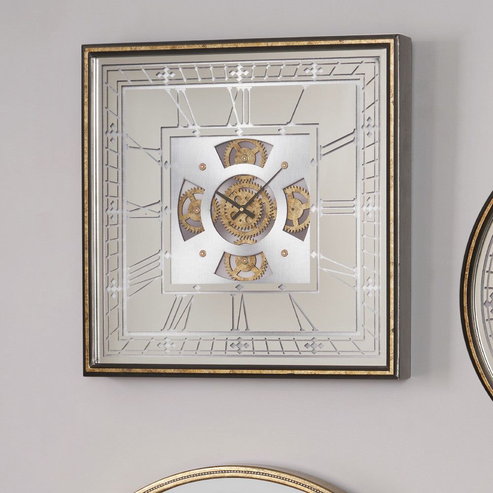 Antique Gold Wood & Mirror Square Working Cog Wall Clock