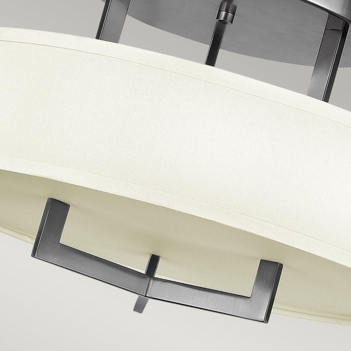 Hampton is a modern transitional design, offering the ultimate in urban sophistication. The minimal rectangular frame, paired with a decorative acrylic etched bottom lens, is softened by a contemporary off-white linen drum shade.