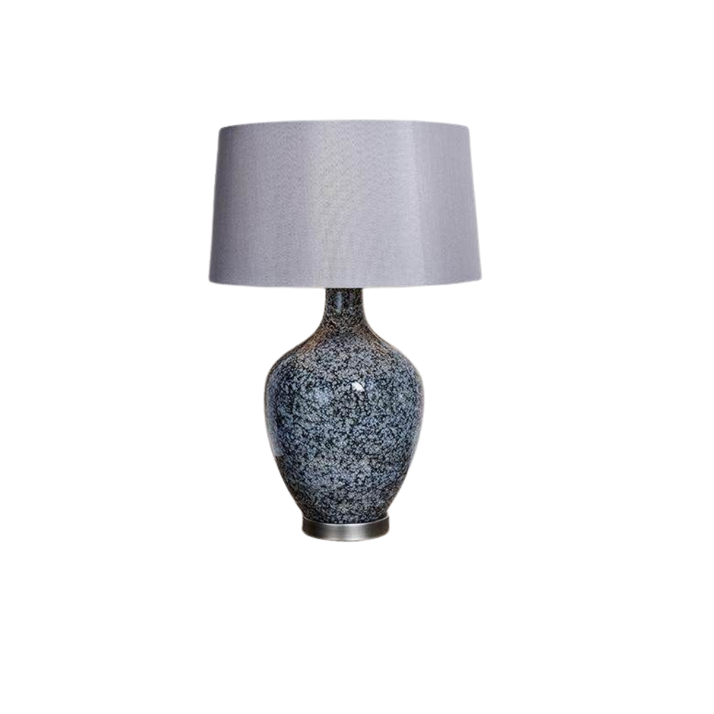 An elegantly shaped black glass table lamp with grey speckled details, perfectly partnered with a mink faux silk tapered shade.