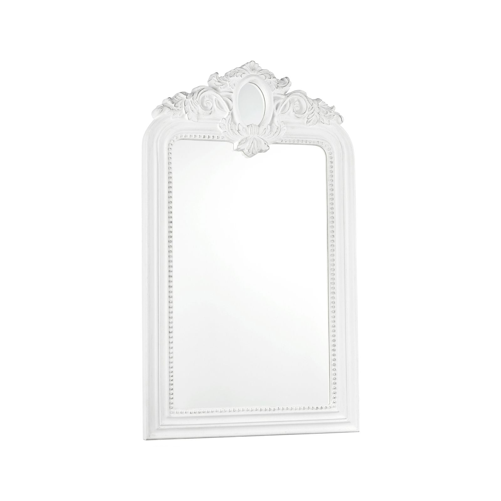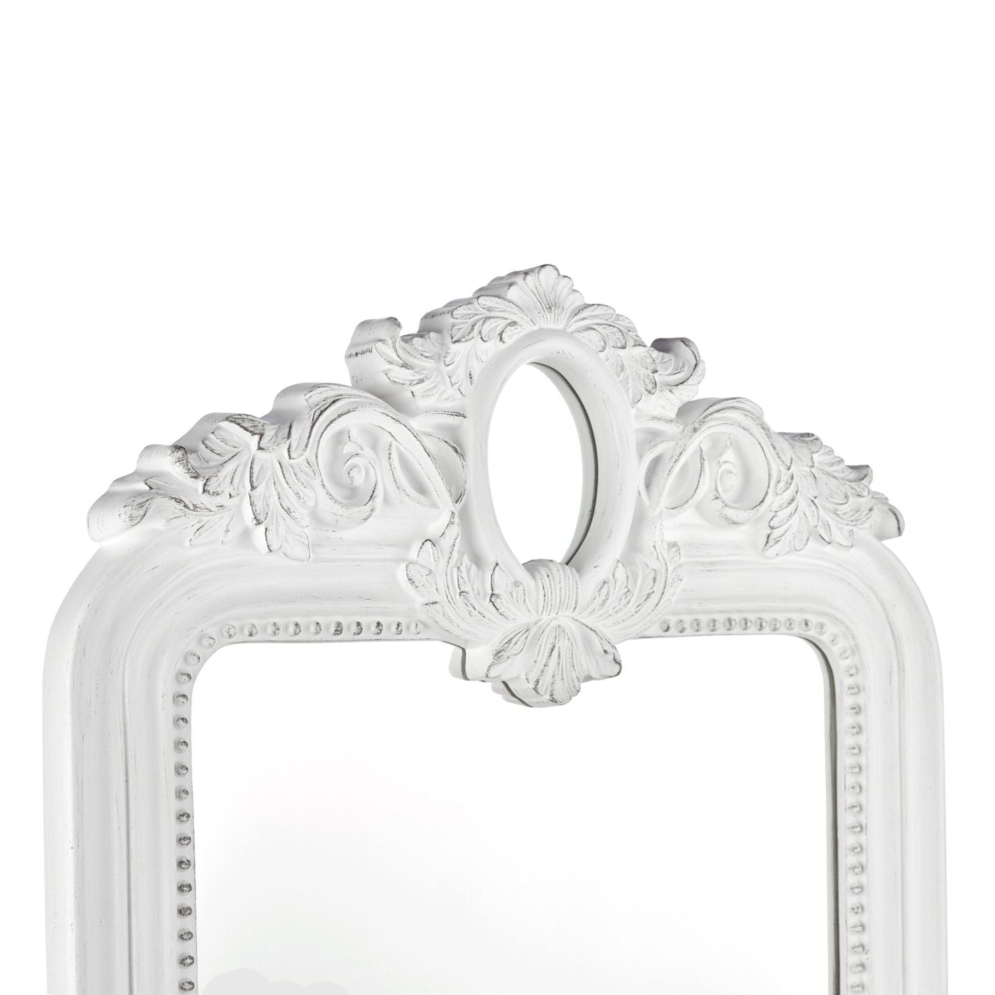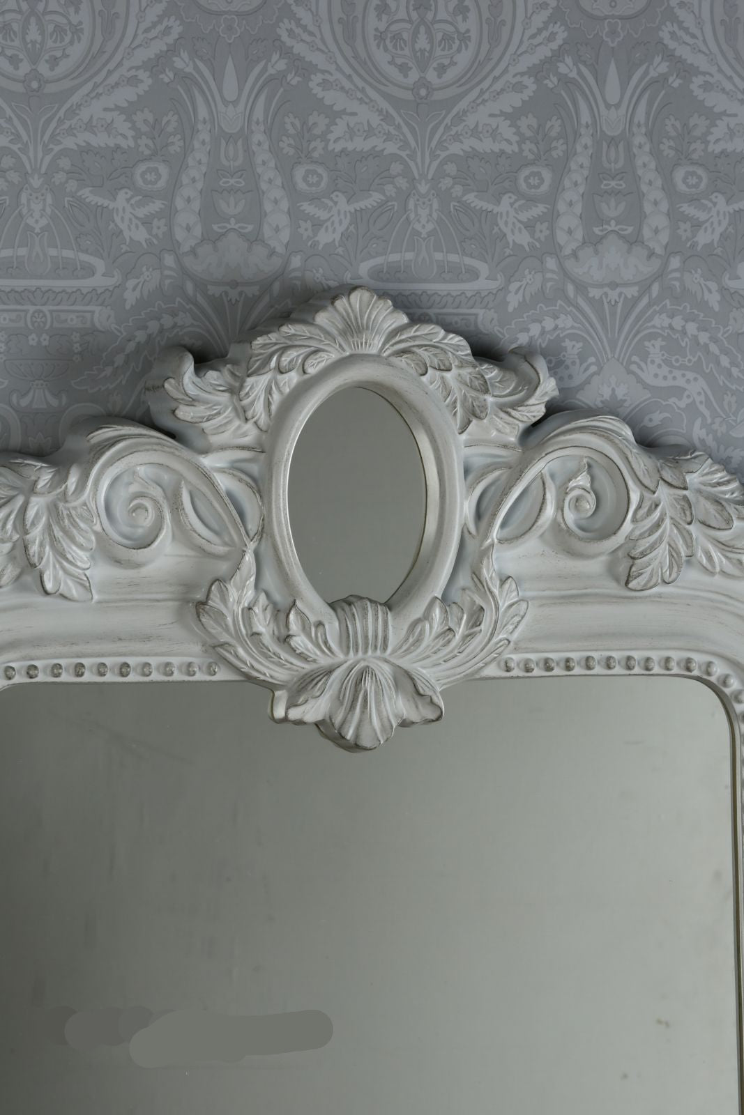 Finished in distressed Ivory with grey highlighting, the Alana is an ornate masterpiece heavily influenced by French baroque style. It features a second, small mirror embedded in the leafy crowning embellishment. More than a mere home accessory, the Alana mirror will become the heart of your home. The distressed paint finish adds to the antique effect, perfectly complementing the deeply carved details and heavy mouldings.