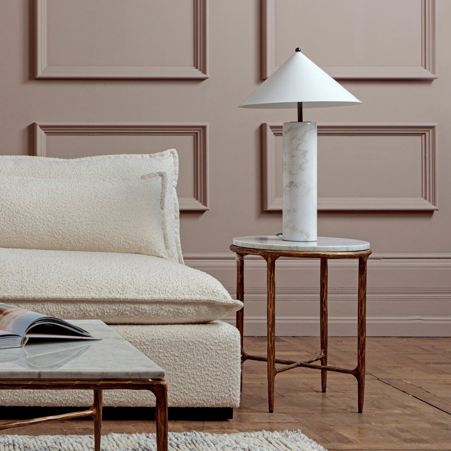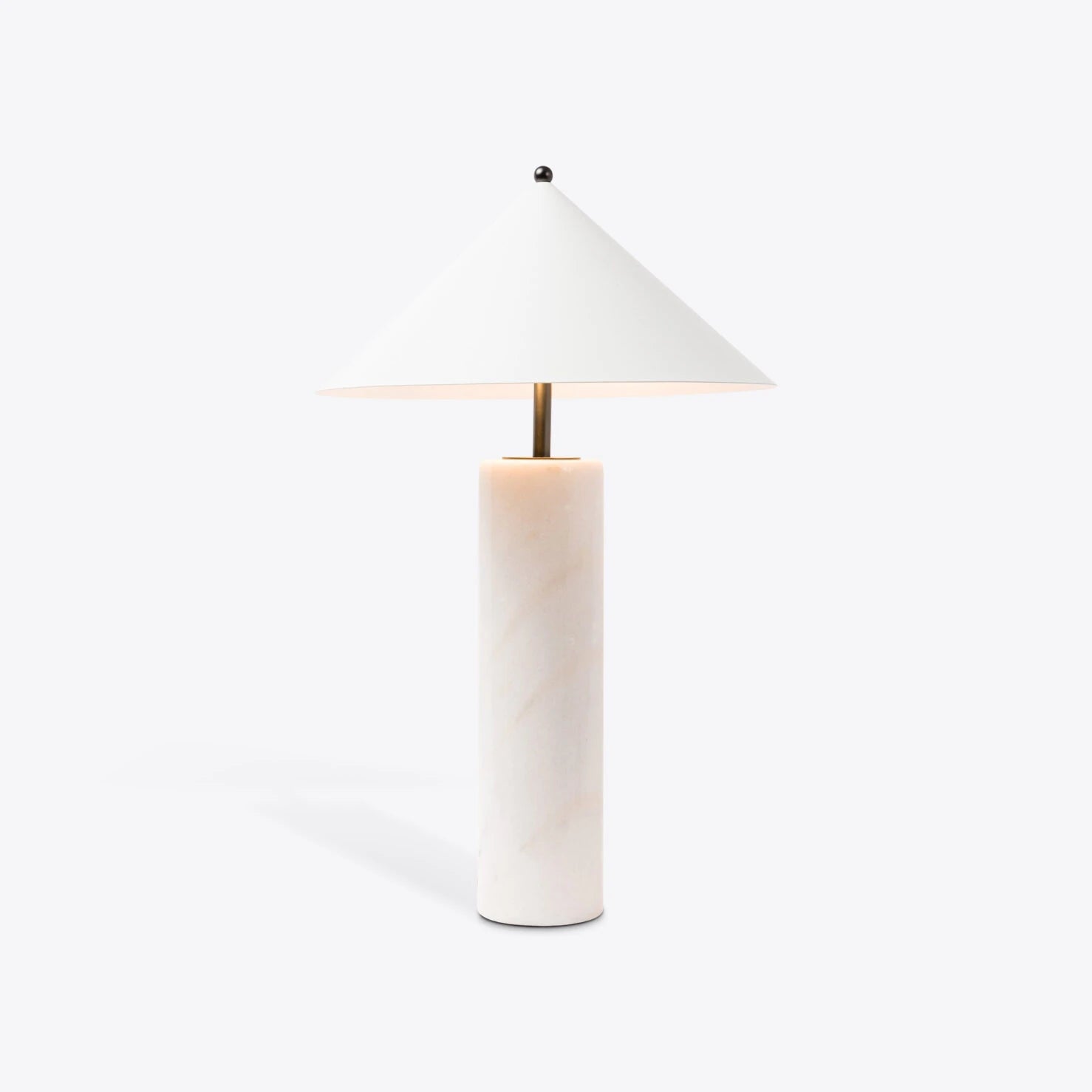The Alaska table lamp is a striking and timeless light formed of a white marble cylindrical base and a sleek coolie metal shade in white. At 65cm in height, this lamp is ideal for use in a living room or place in a pair in an entrance hall.