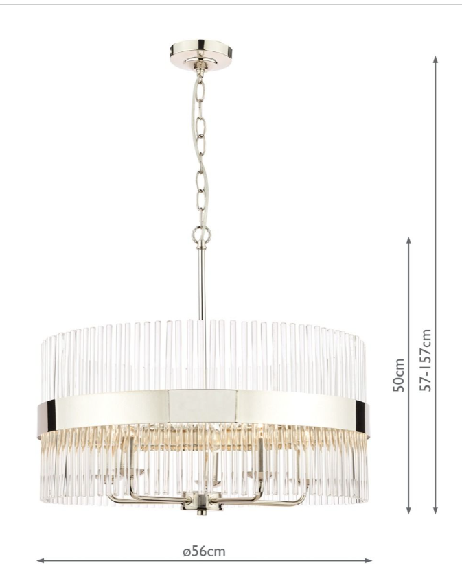 This ceiling pendant fitting has a matching finish ceiling rose and hanging chain plus a discreet clear cable. Height is adjustable at the point of installation (57–157cm).