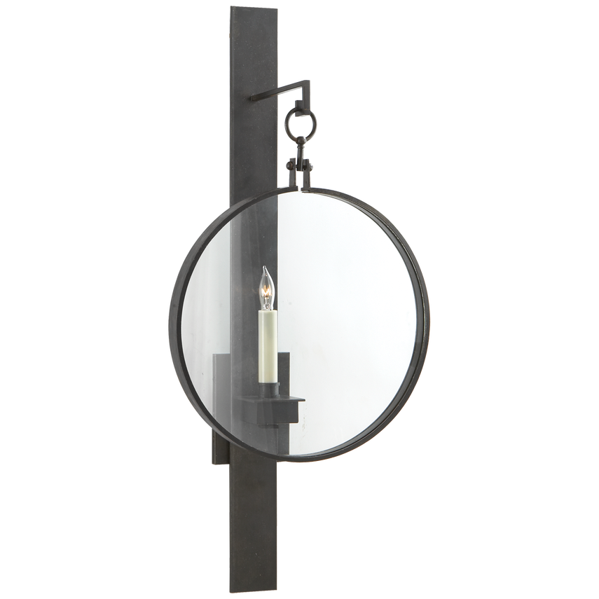 The versatile Alice by Suzanne Kasler strikes a dramatic vintage silhouette for a variety of spaces. Two sizes of wall sconces present an elongated, rectangular back in aged iron from which a candle arm and bulb extend, framed by a large glass plate suspended from a slender arm above.
