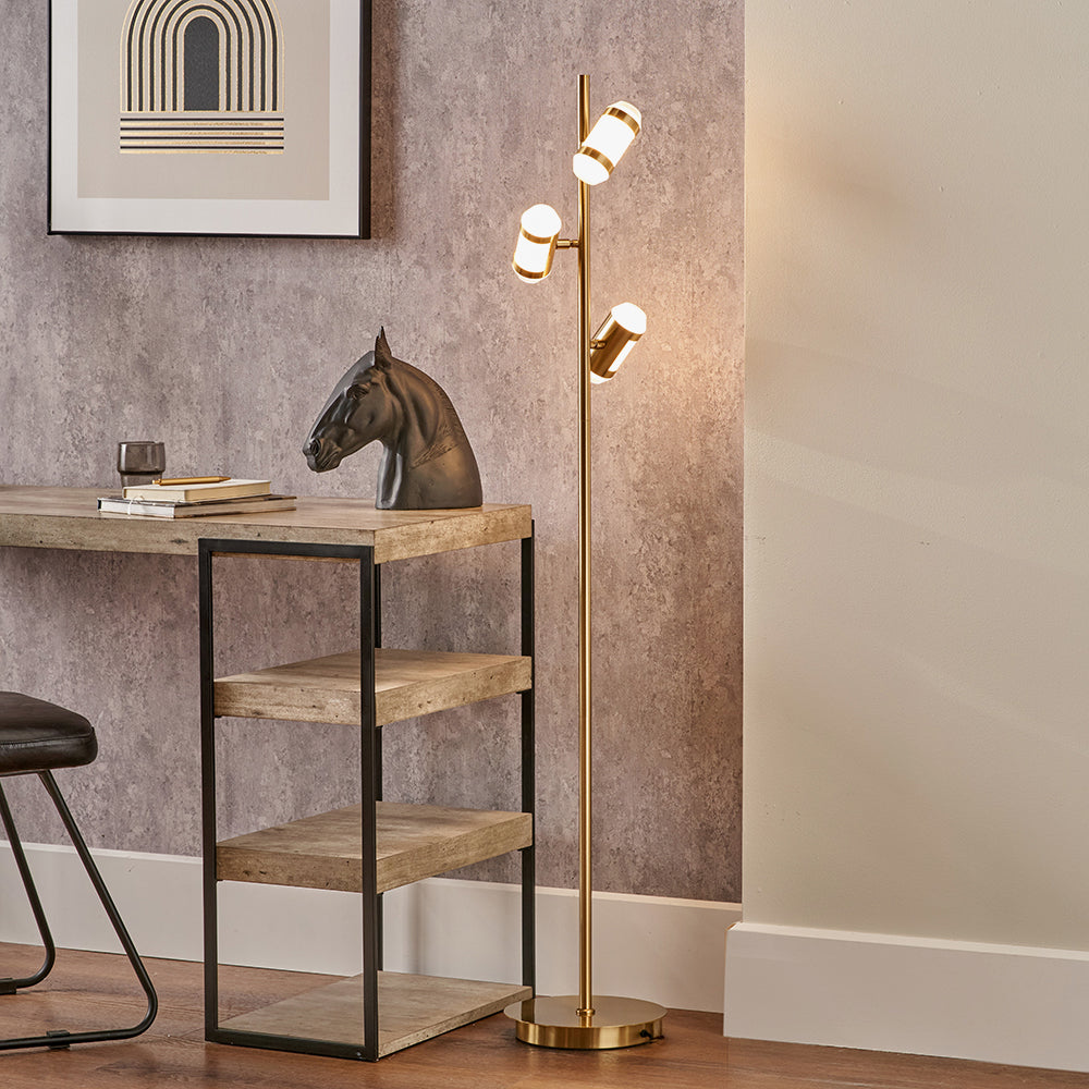 Our Alondra floor lamp is sure to make a statement, with its luxury combination of gold-toned metal and white glass. The LED floor lamp adds a contemporary and elegant flair to any room. Illuminate your space with style and sophistication.