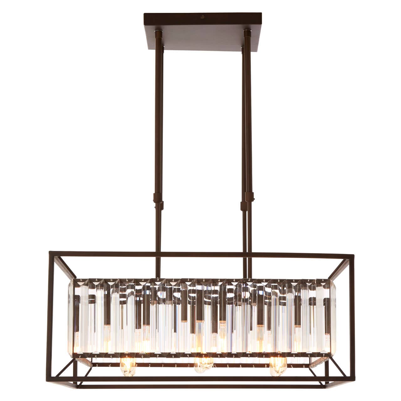 "The Aliko pendant lamp features simple, uncomplicated iron design lines. The black finish is painted by hand, and the frame is open. When in use, light diffuses gently through the array of glass tiles."