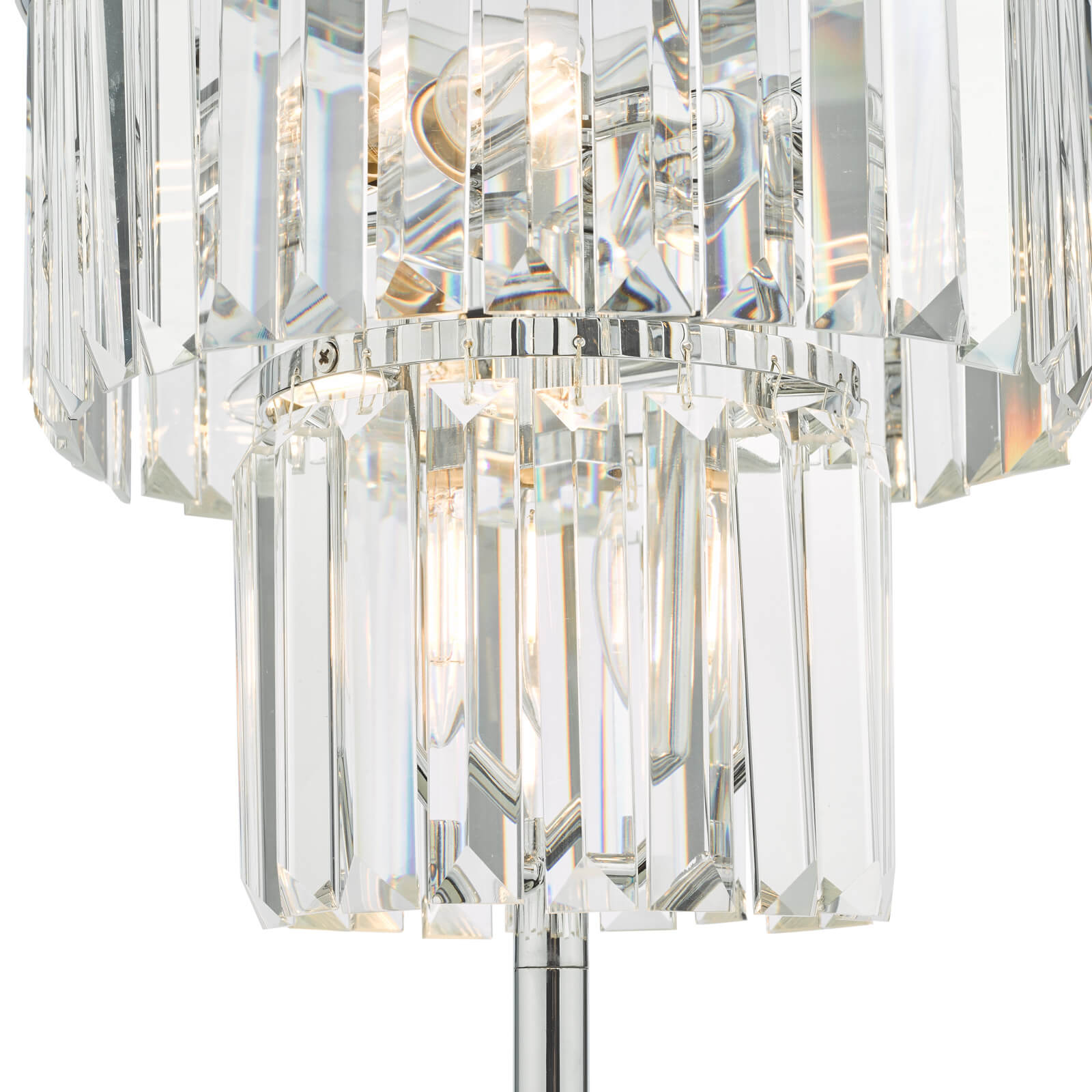 The Angel 4 light table lamp is a cascading waterfall of bevelled crystal suspended from a polished chrome frame. The grand proportions and show-stopping crystal make the Angel table lamp a remarkable statement piece on its own or can be used to complement the rest of the extensive Angel range.Fitted with a black cable and an inline rocker switch for ease of switching. The broad, heavy base with stepped detail keeps the table lamp stable but should be used on a flat surface.The Angel table lamp takes 4 SES (E14) golf ball lamps, which are not supplied. We recommend using LED filament lamps from our range of LED bulbsThe Angel table lamp would make a stunning bed-side table or a great addition to your living room.