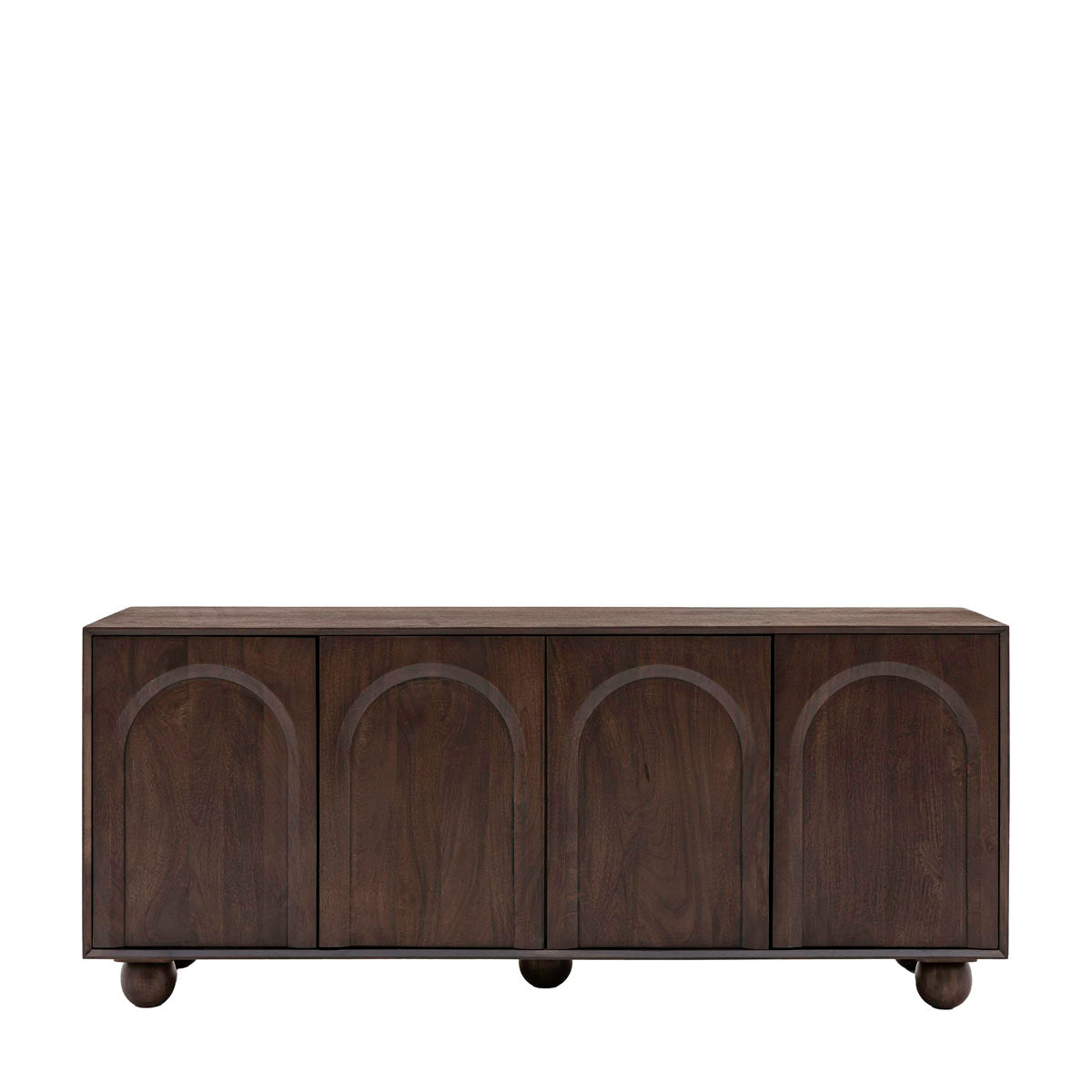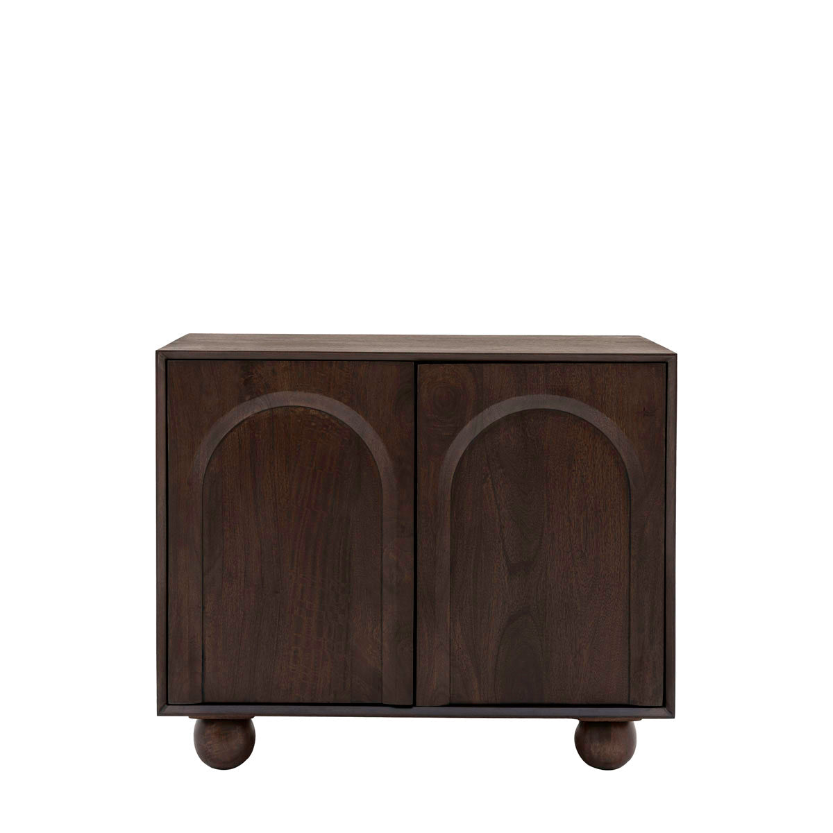 With a 70s influence, this sideboard exudes retro cool. The dark stained Mango wood is full of rich grains which is highlighted by the relief arch design in each of the 2 doors. Finished off with rounded ball feet and internal shelves offering plenty of storage this unit is a must have for any trendy home.