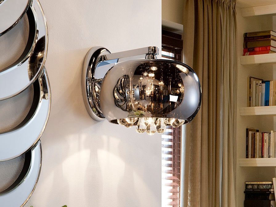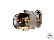 Wall lamp made of metal, chrome finish. Shimmered glass shade with Murano-style inner crystal drops. Includes 1 G9 LED 6W. 110v version available.