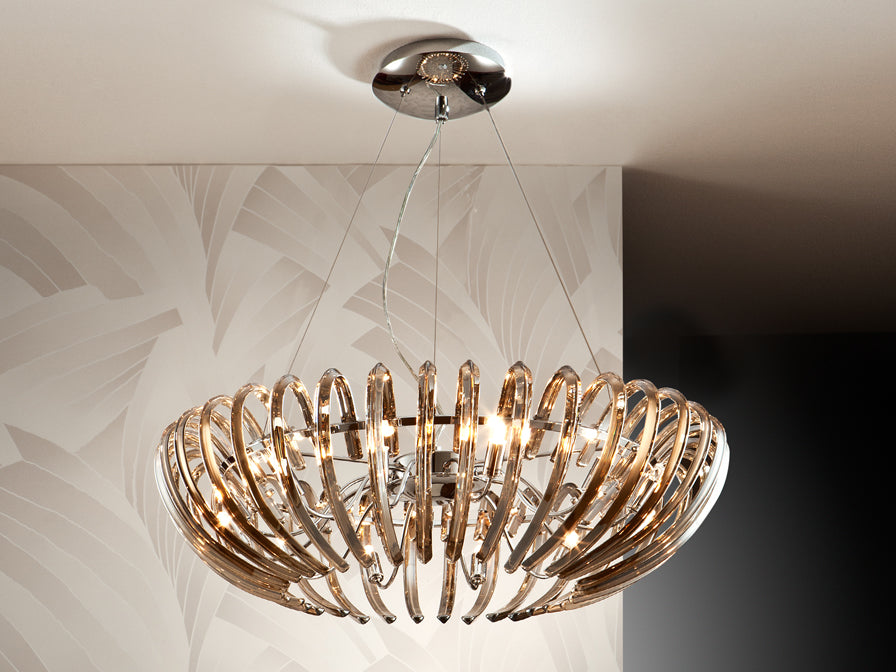 Lamp of 12 lights made of metal, chrome finish. Glass shade formed by high quality curved crystal bars in champagne colour. Adjustable in height by steel tensors.