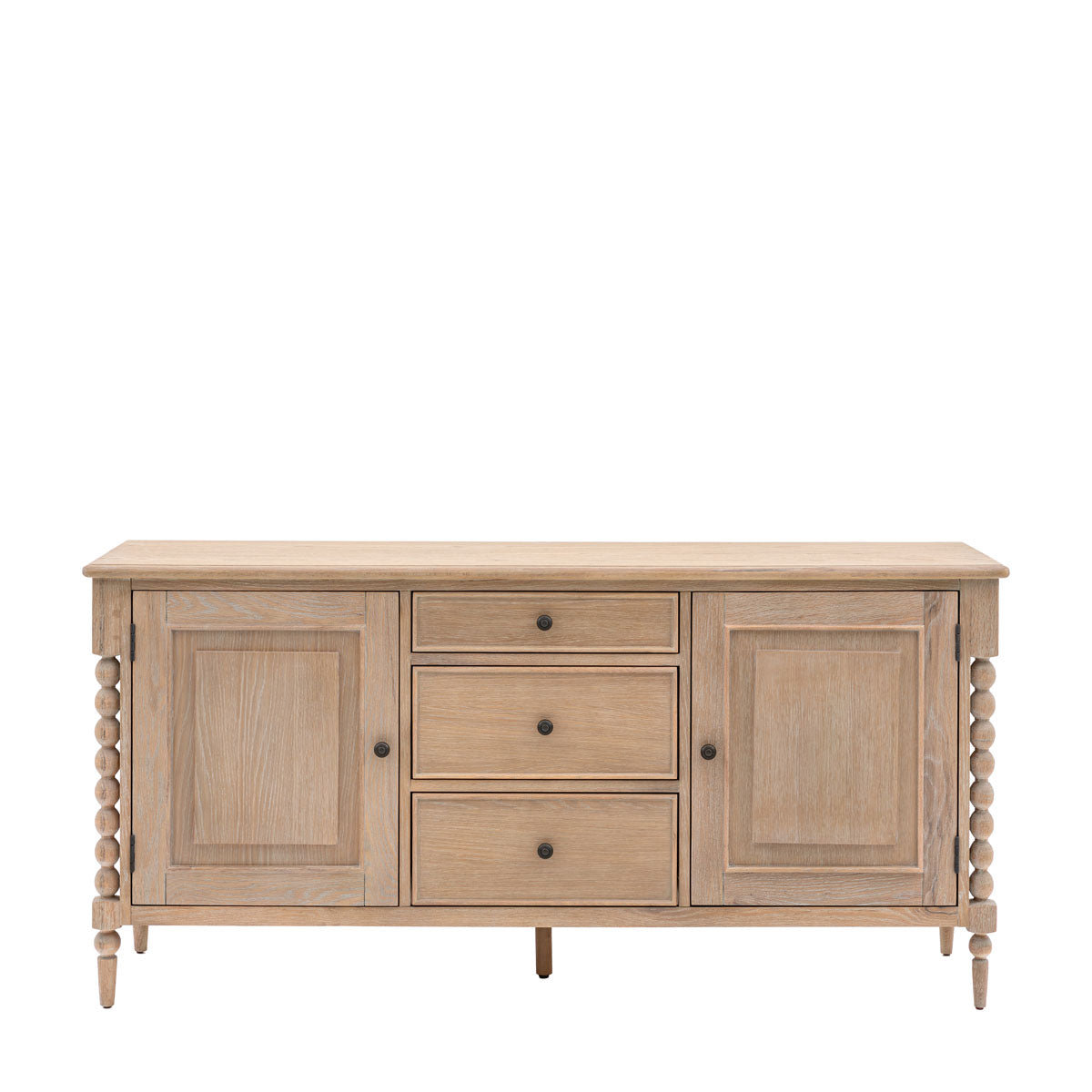 Offering practical storage combined with beautiful design, this stunning sideboard would make a stylish addition to any living or dining room. The play on a classic look emphasises the hand-crafted bobbing detail down each corner. This eye-catching design feature is created by turning the wood on a lathe, a task carried out by the finest craftsmen. The sideboard is made using beautiful oak solids and veneers where practical, with a very subtle lime wash tone to the finish which is soft and mellow. Matching pieces are available.