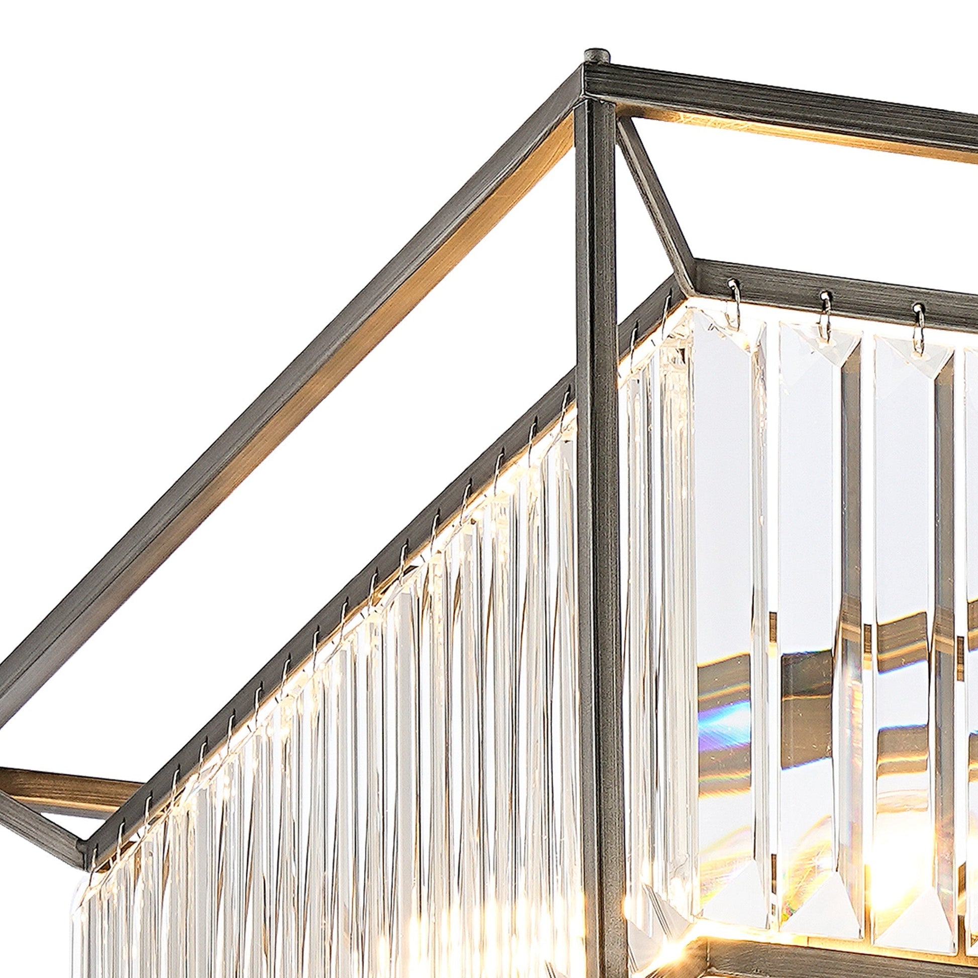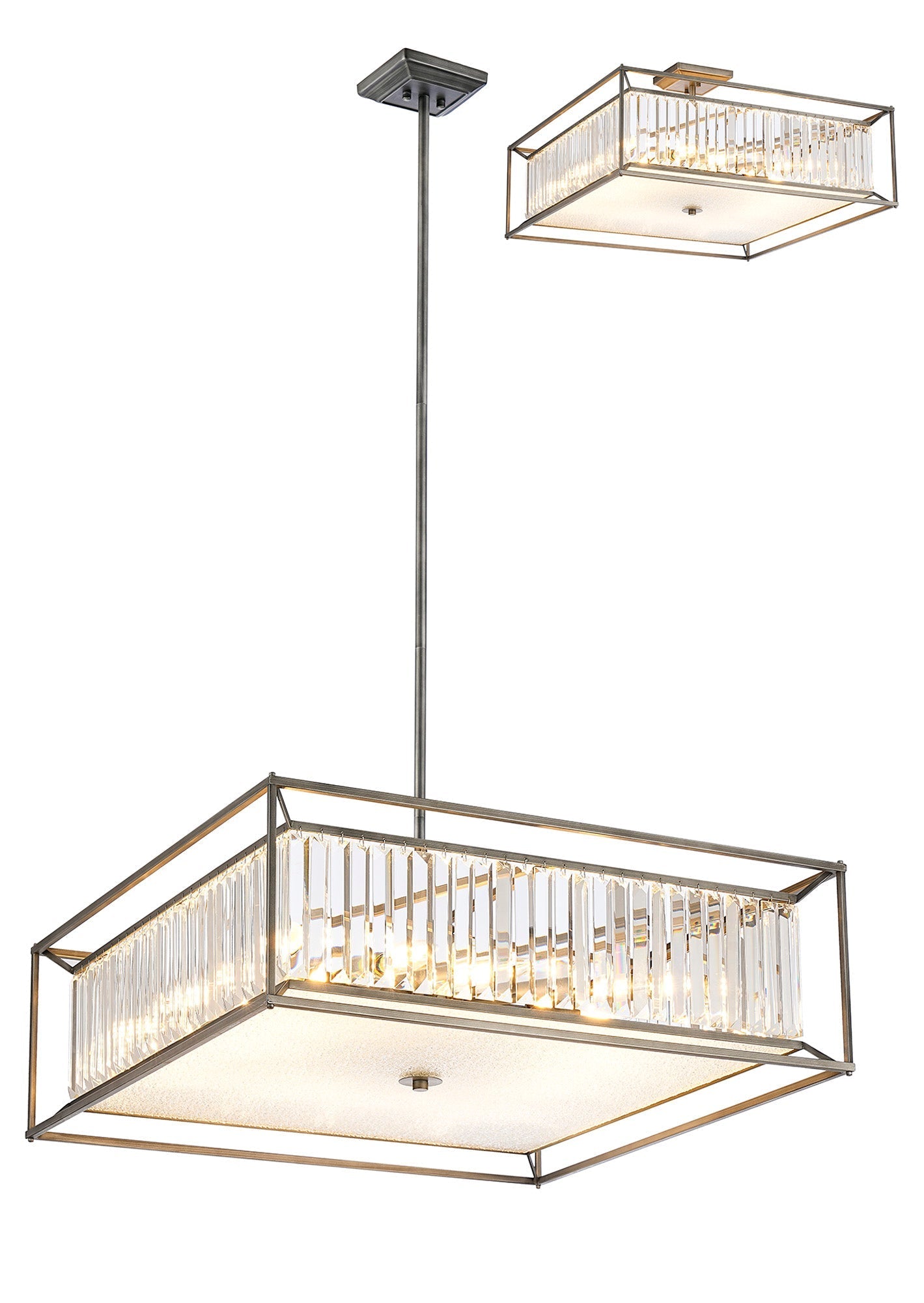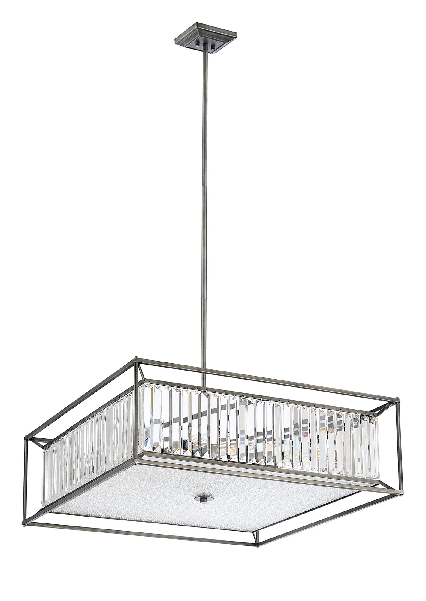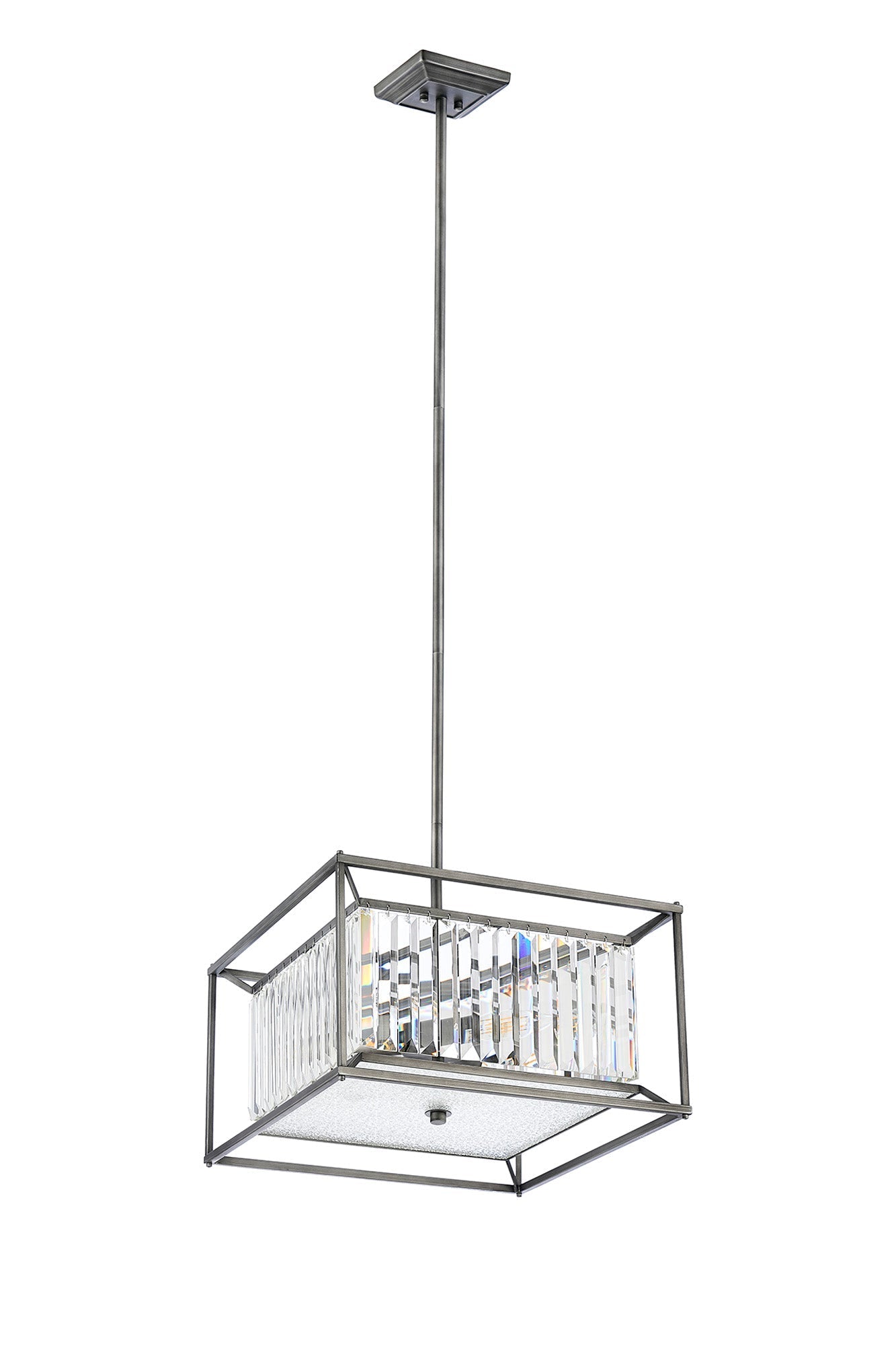 The open cuboid, pewter framework of the Attica range perfectly displays and enhances the inner border of clear rectangular crystal pieces. Available in three sizes, each pendant suspended by a fixed rod is supplied with additional parts so they can be converted to a semi flush fixture. The high quality crystals conceal the E14 lamp holders for an artistic visual when both illuminated and not. The grain glass diffuser which sits underneath the crystals provides an even more attractive dispersal of light. A contemporary range, Attica harmonises an old world colour finish with modern sparkle.