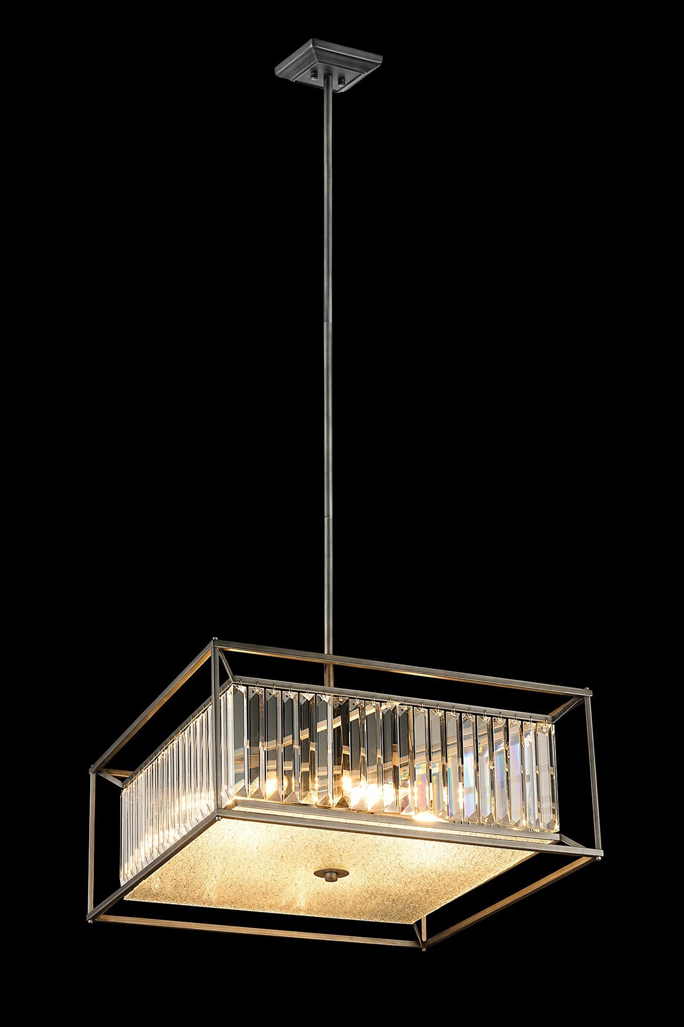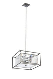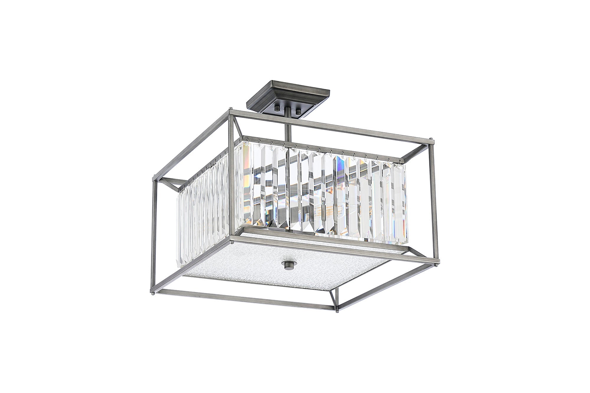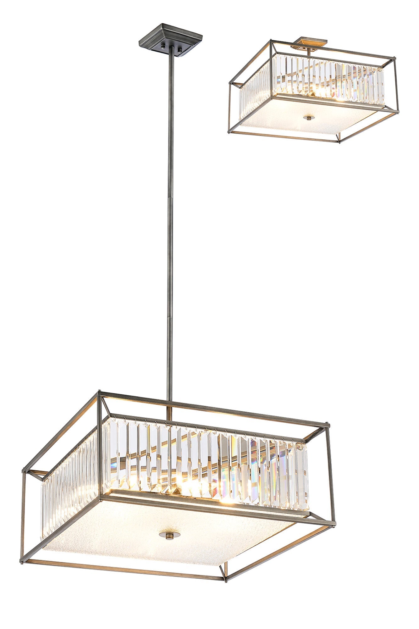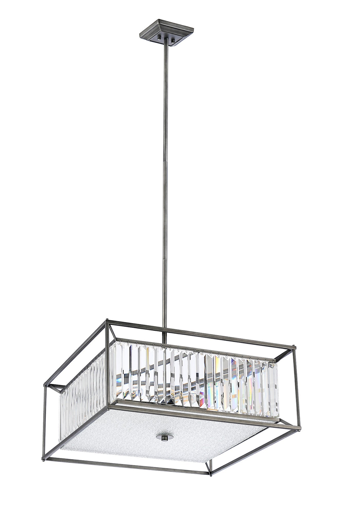 The open cuboid, pewter framework of the Attica range perfectly displays and enhances the inner border of clear rectangular crystal pieces. Available in three sizes, each pendant suspended by a fixed rod is supplied with additional parts so they can be converted to a semi flush fixture. The high quality crystals conceal the E14 lamp holders for an artistic visual when both illuminated and not. The grain glass diffuser which sits underneath the crystals provides an even more attractive dispersal of light. A contemporary range, Attica harmonises an old world colour finish with modern sparkle.