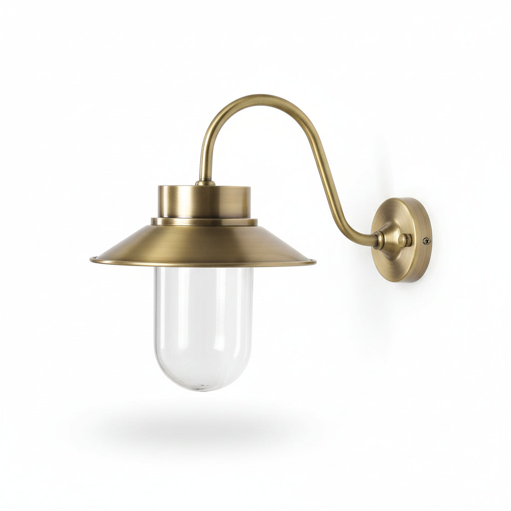 Finished in sleek , the fixture features a gracefully curved arm and a wide metal shade that casts light downward for focused illumination. The clear glass enclosure protects the bulb while allowing its warm glow to shine through, making it perfect for entryways, patios, or garden paths