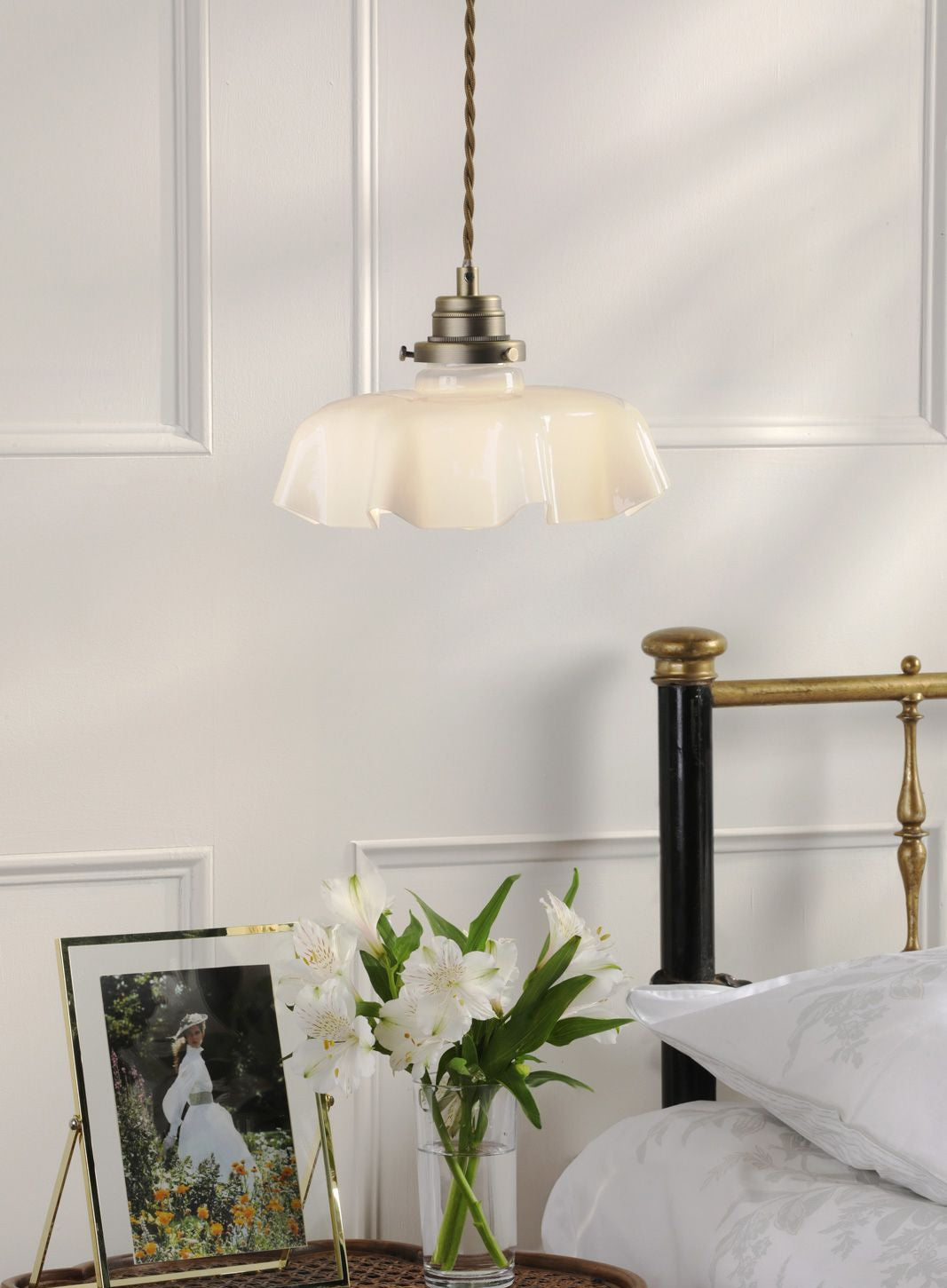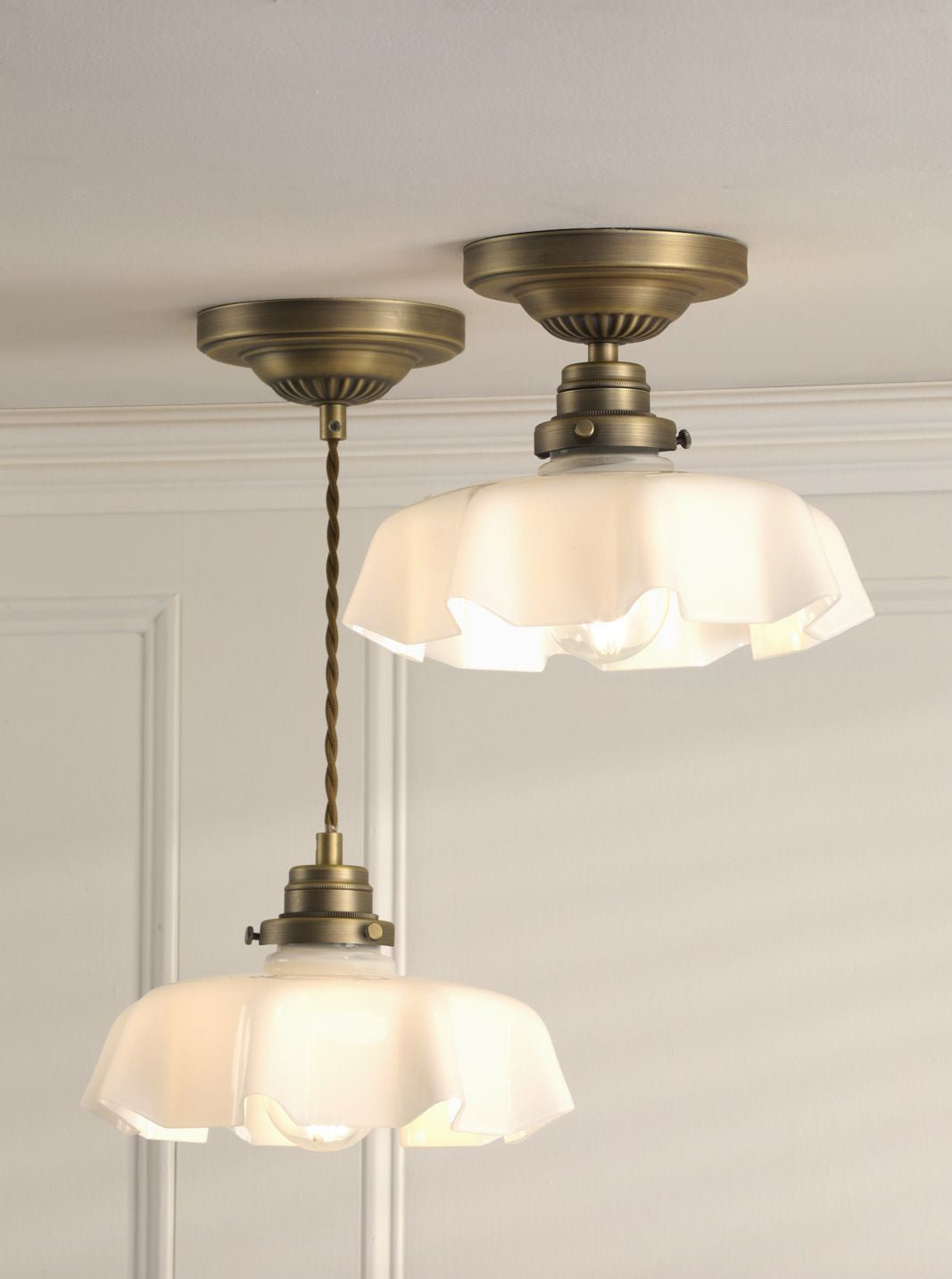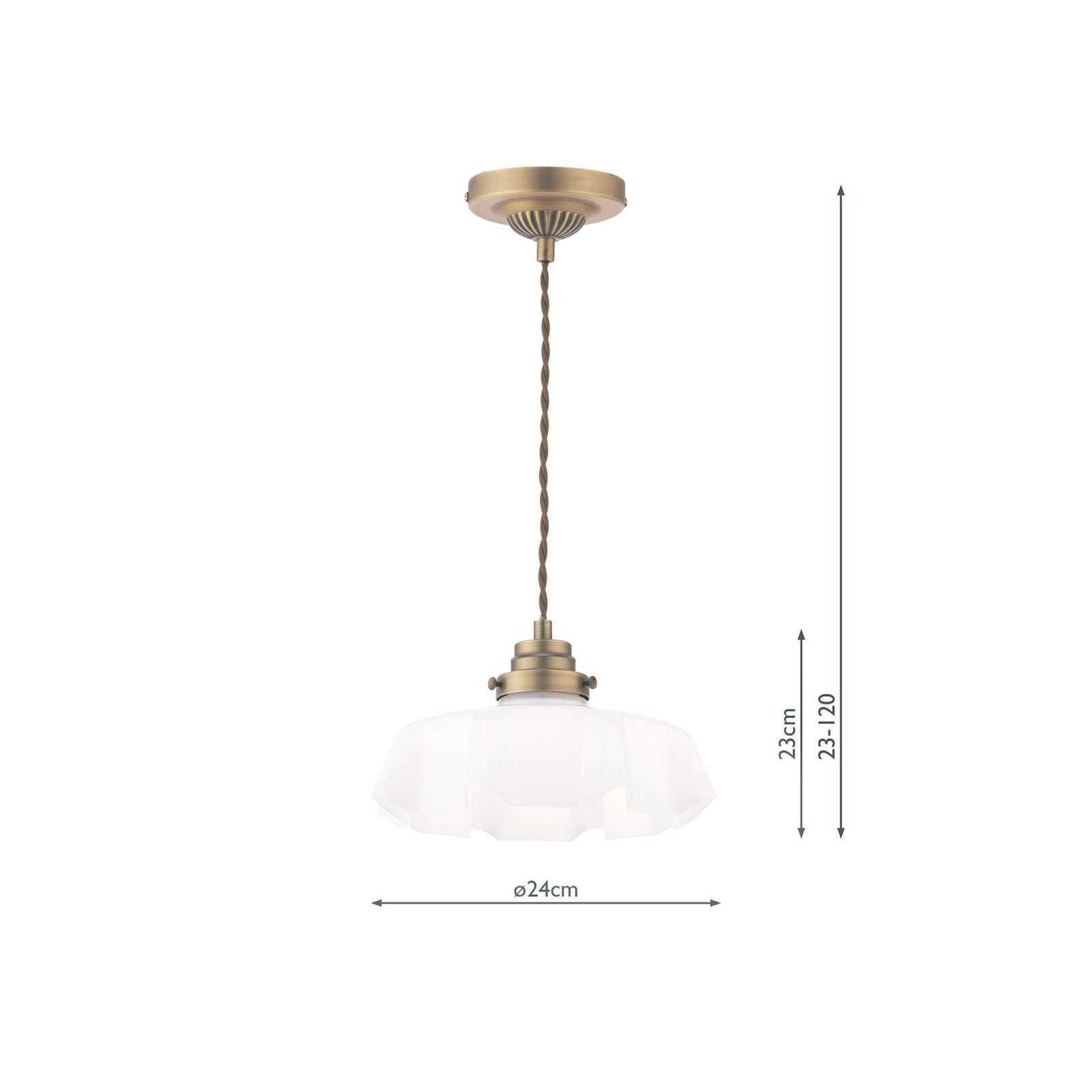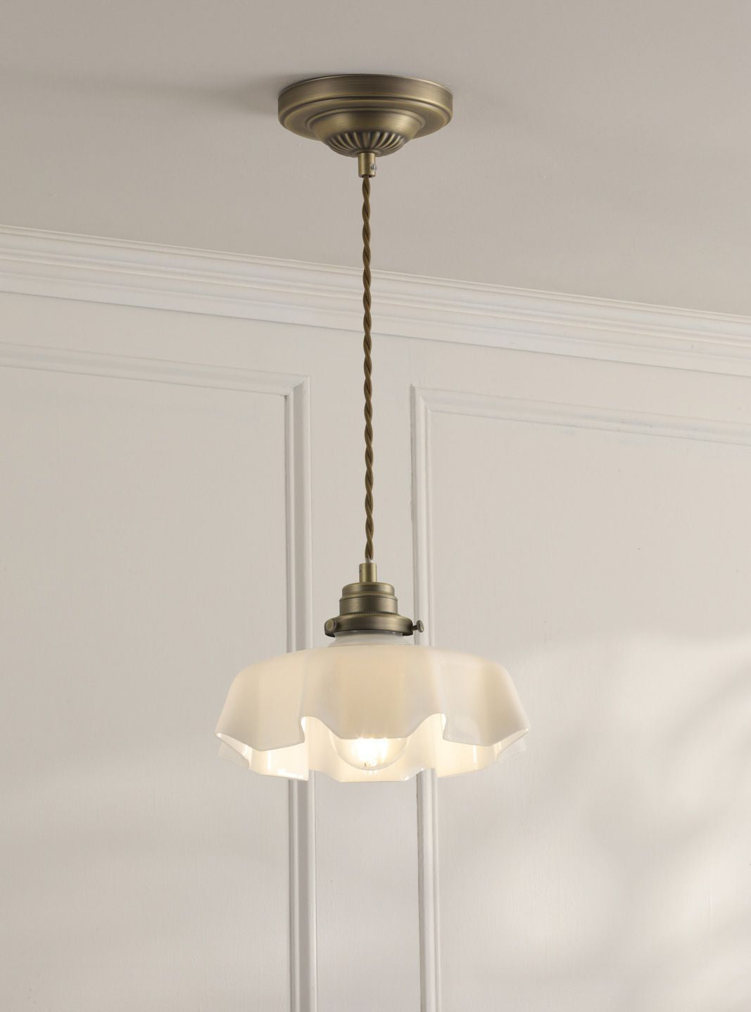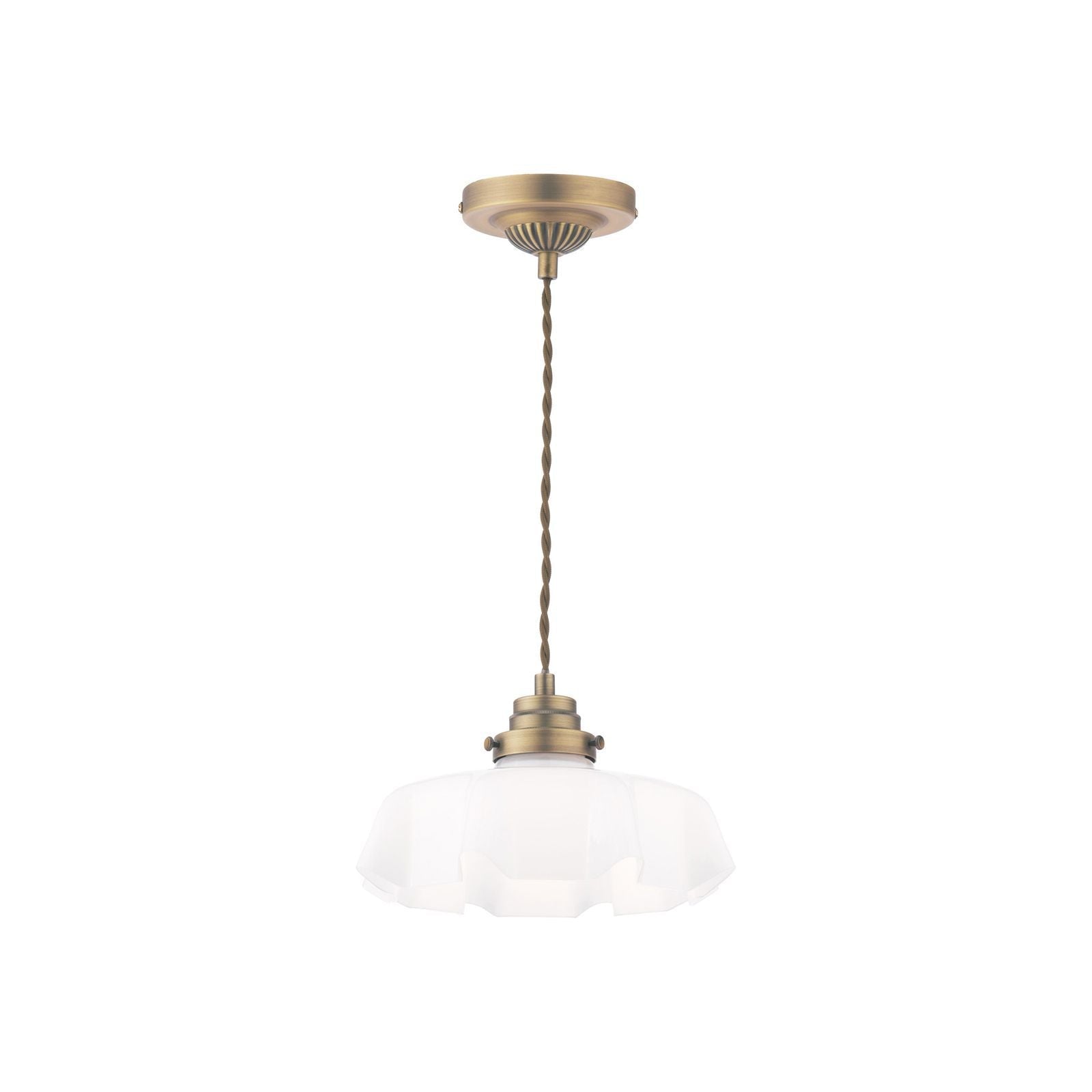 This timeless ceiling light in white glass fluted glass and Antique brass will suit any room in the house. The Banham pendant light is height adjustable upon installation and is supported by a twisted cord suspended from a detailed ceiling rose. This ceiling light will illuminated a wide area; select a feature light bulb as the bulb is visible.