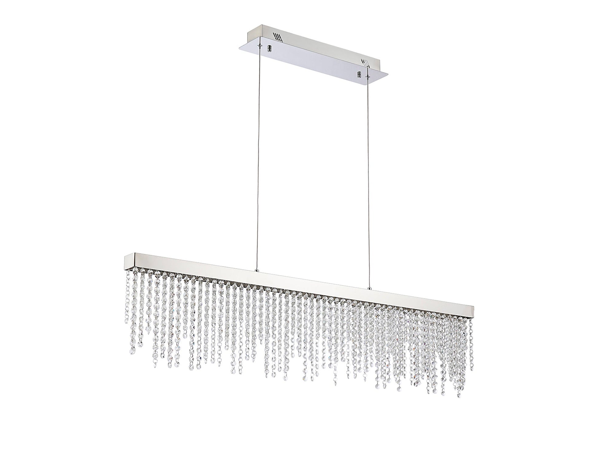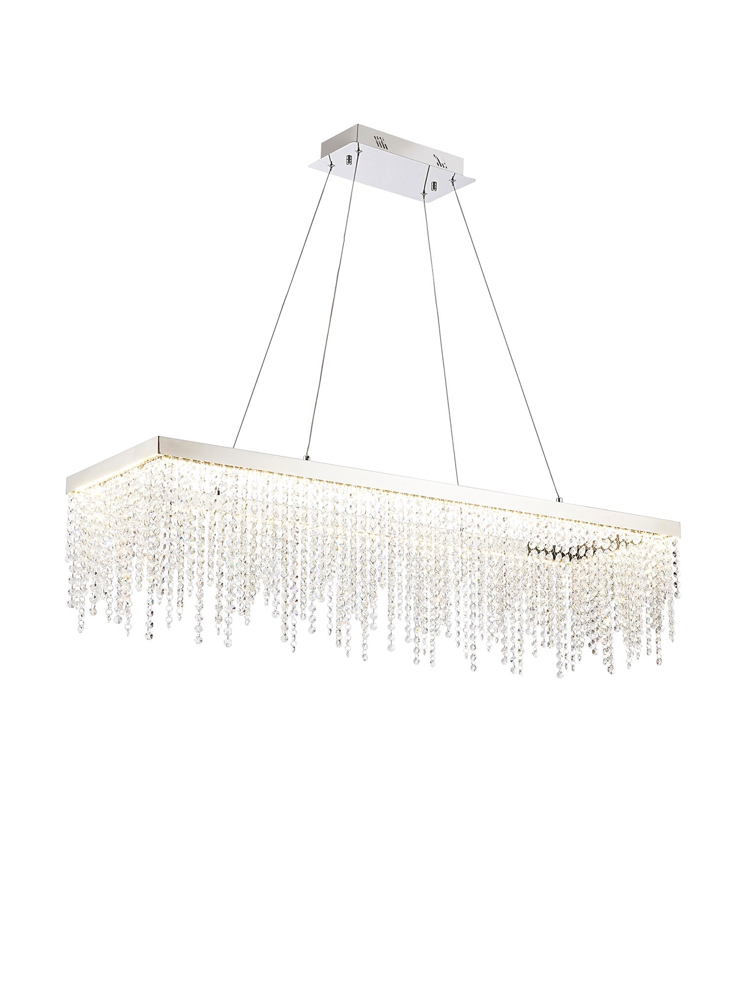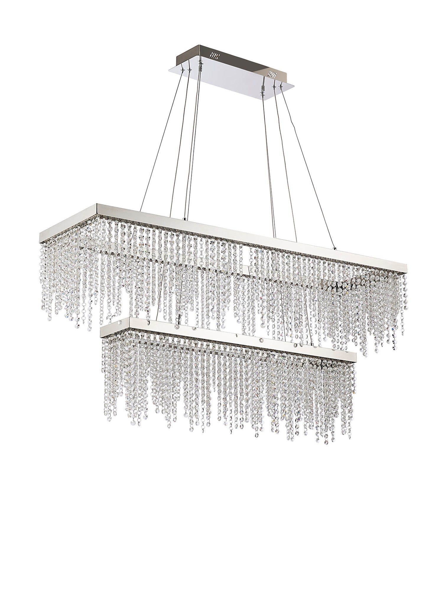 The Bano collection sees strands of clear crystal buttons cascade at different lengths creating a beautiful waterfall effect. This is especially amplified by the doubled inner and outer layering of these strands producing a more substantial presence of crystal and sparkle. The natural crisp white of the integral LEDs draws even more attention to the crystals impact while effectively illuminating their given setting. Every fixture within the range from the eye catching array of pendants to the complementing wall lamps are dimmable, a key feature that is often missing from low energy LED lighting. Bano is available in either are polished chrome or french gold colour finish.
