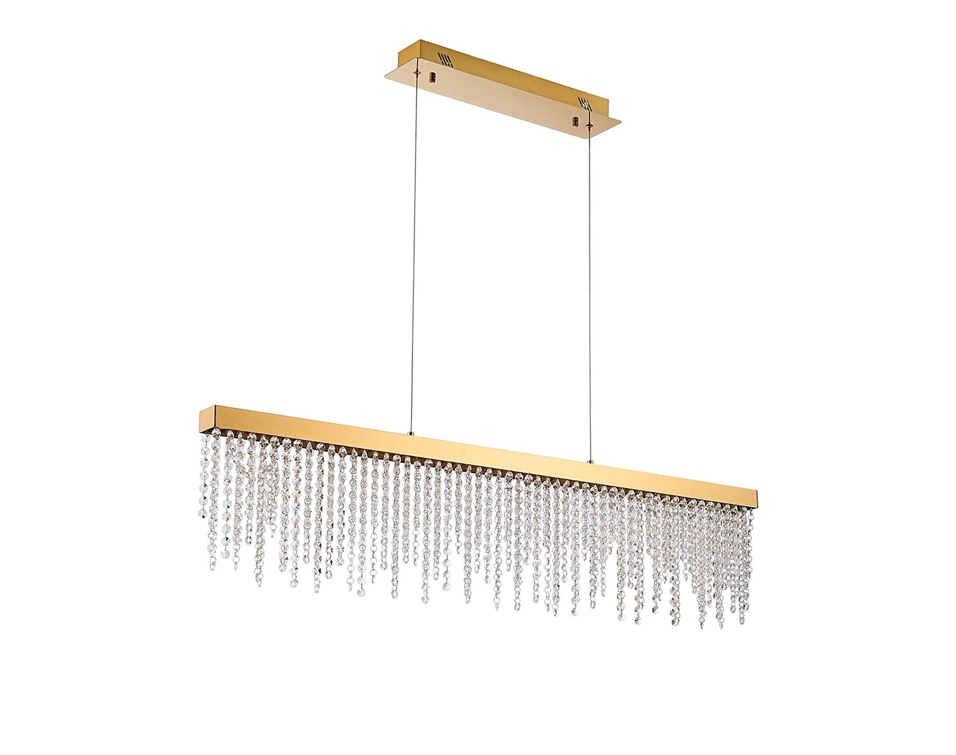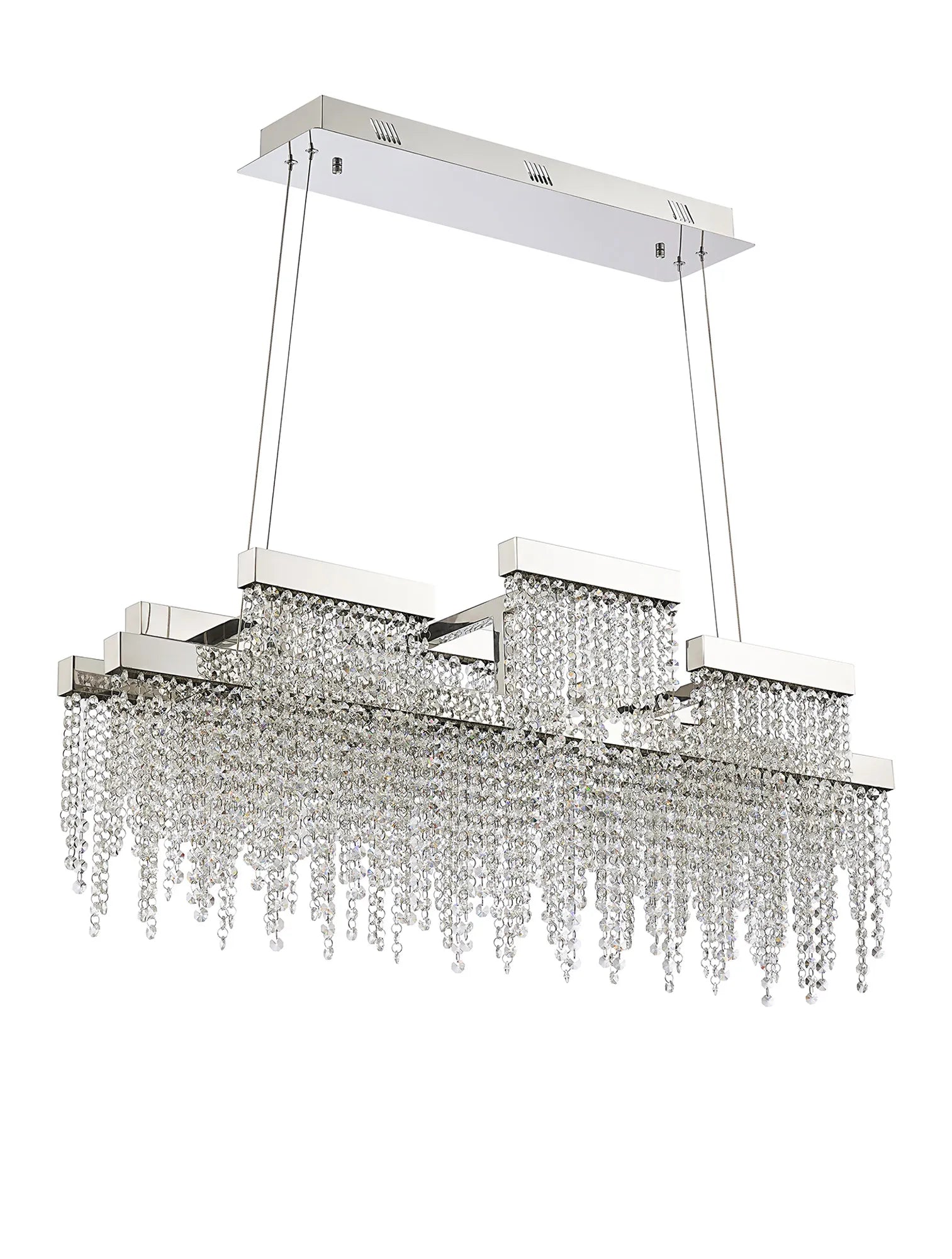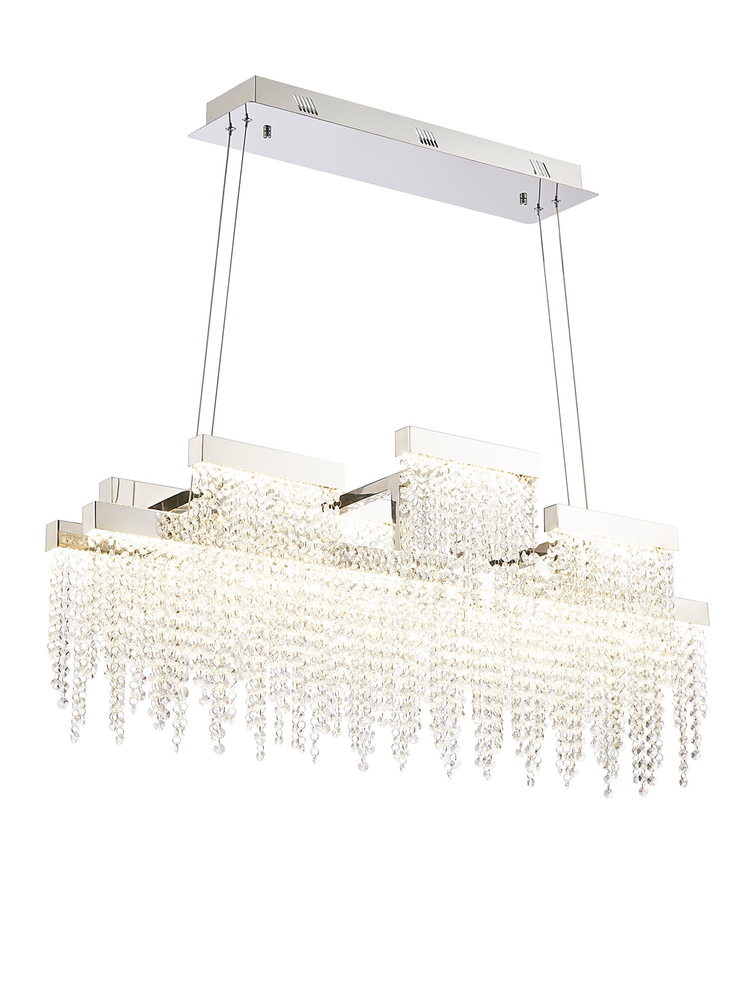 The Bano collection sees strands of clear crystal buttons cascade at different lengths creating a beautiful waterfall effect. This is especially amplified by the doubled inner and outer layering of these strands producing a more substantial presence of crystal and sparkle. The natural crisp white of the integral LEDs draws even more attention to the crystals impact while effectively illuminating their given setting. Every fixture within the range from the eye catching array of pendants to the complementing wall lamps are dimmable, a key feature that is often missing from low energy LED lighting. Bano is available in either are polished chrome or french gold colour finish.