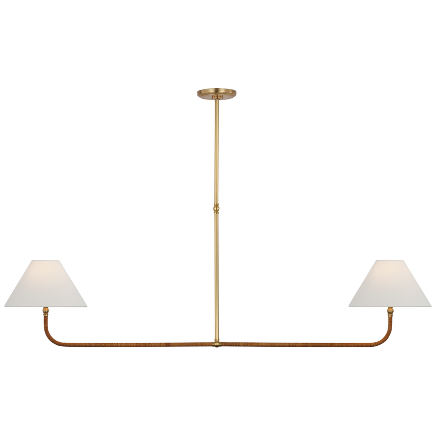 Basden Extra Large Linear Chandelier in Antique-Burnished Brass and Natural Rattan with Linen Shades