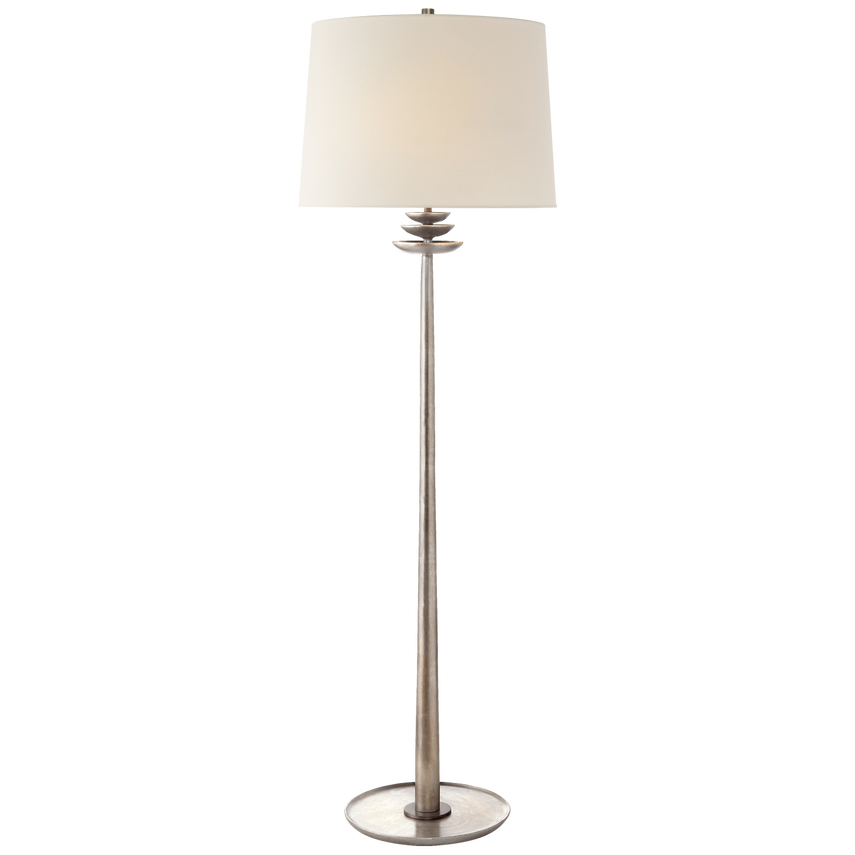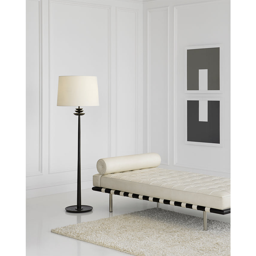 The Beaumont by AERIN reframes a familiar silhouette with contemporary detailing. Sconces, floor and buffet lamps feature petal-like tiers that add an organic touch to open spaces such as libraries or sitting rooms. Full linen shades provide ample, sophisticated lighting.
