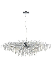 In chrome finish with a mass of crystal glass drops. Suitable for dimming if used with mains voltage halogen lamps. LED G9 lamps should be used but suitability for dimming will depend on the lamp and switch used.