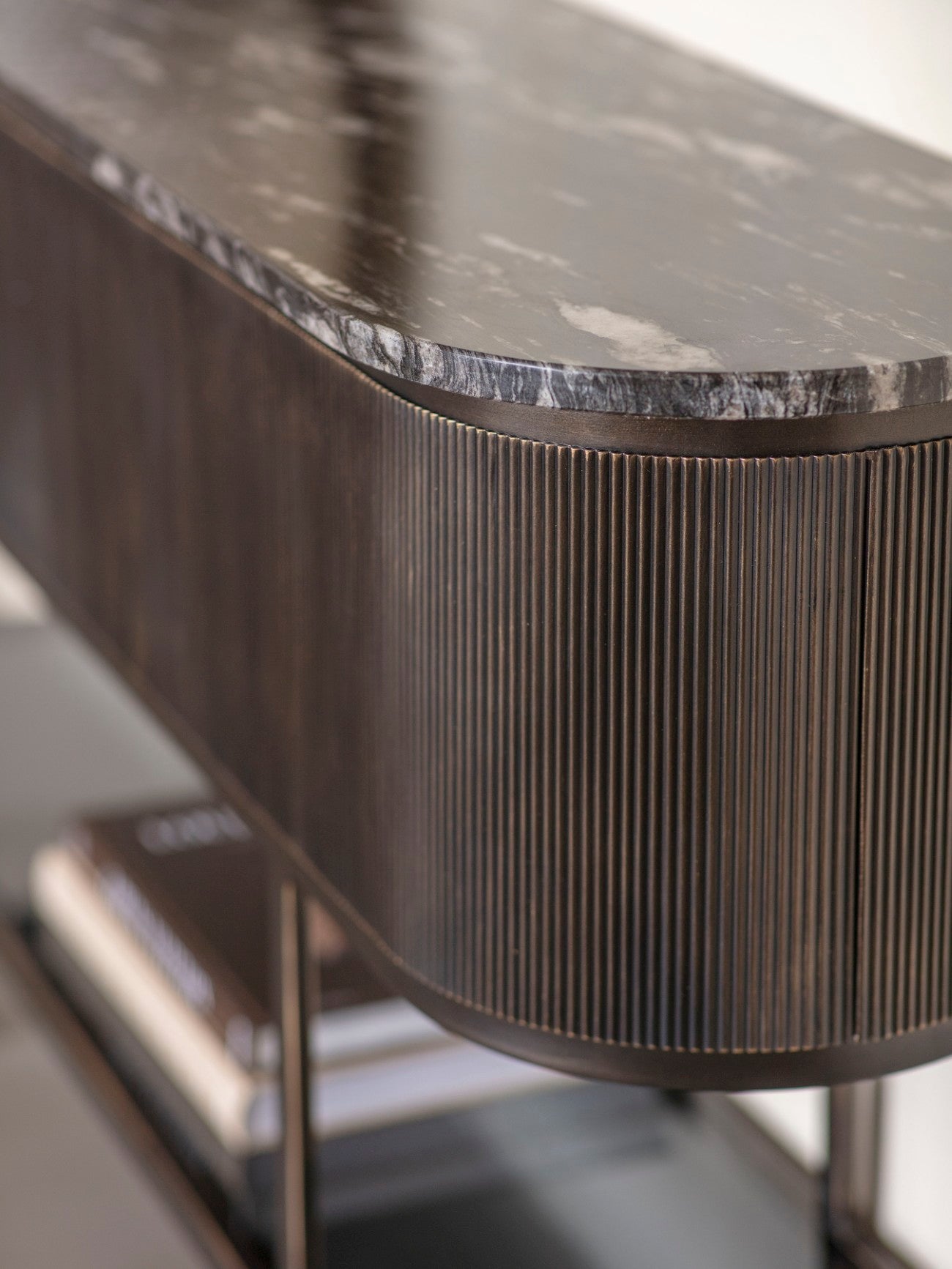 The Belvedere Aged Black Console Table exemplifies contemporary, space-saving design. This elegant console features a smooth gilded dark bronze frame, black tinted glass, and beautiful Markino Marble. It has a glass shelf with a clearance height of 25cm. The natural materials used ensure that each piece is unique and gold is used in highlights to contrast against the black tones. Marble tops will feature individual veining patterns and varied colour hues, while the iron bases may have slight texture variations.