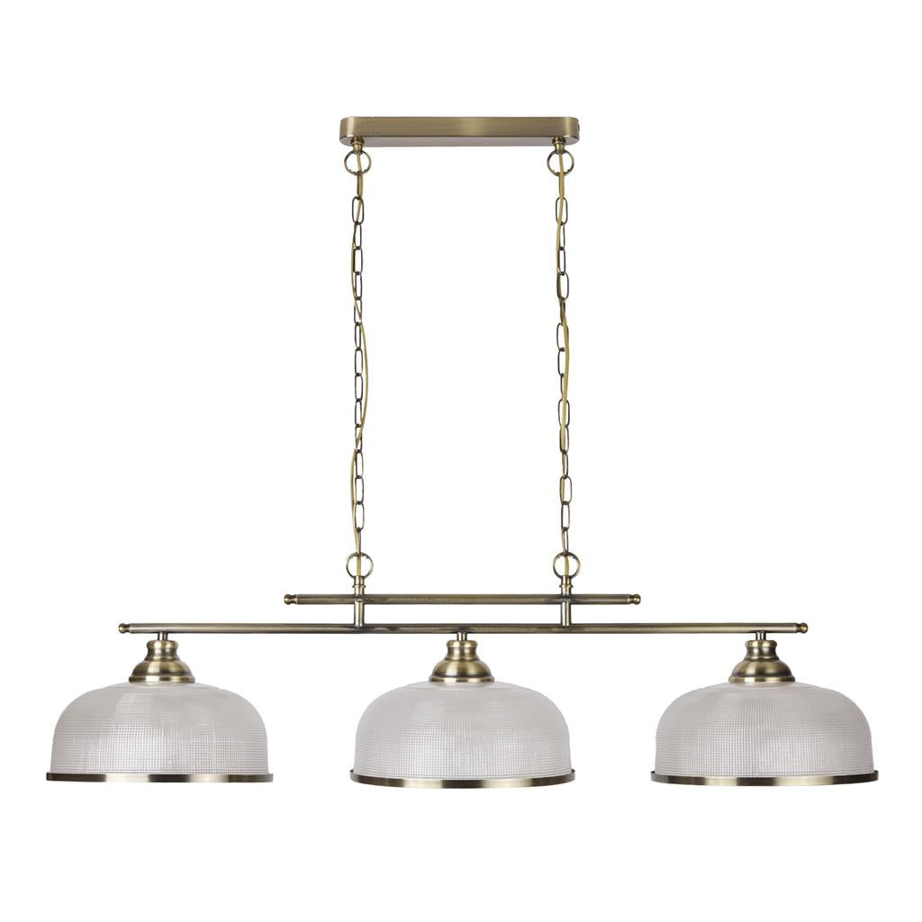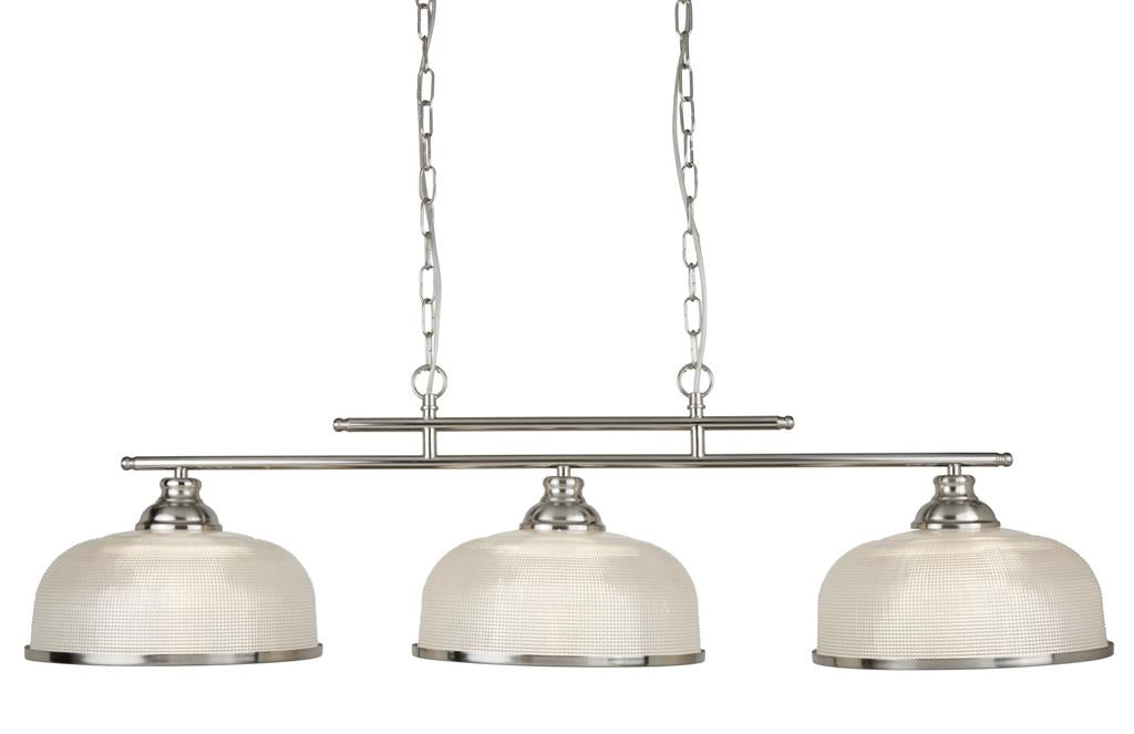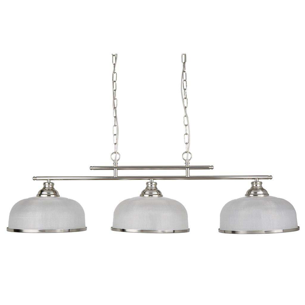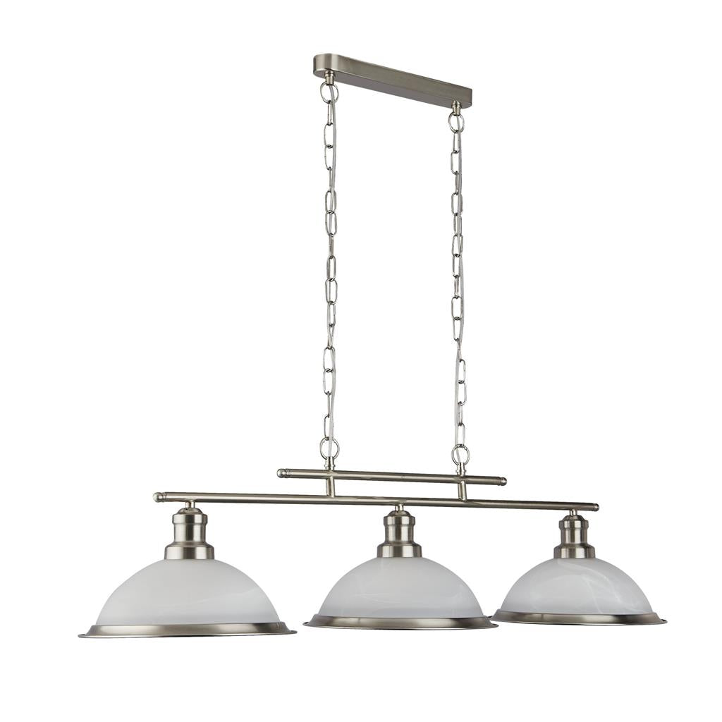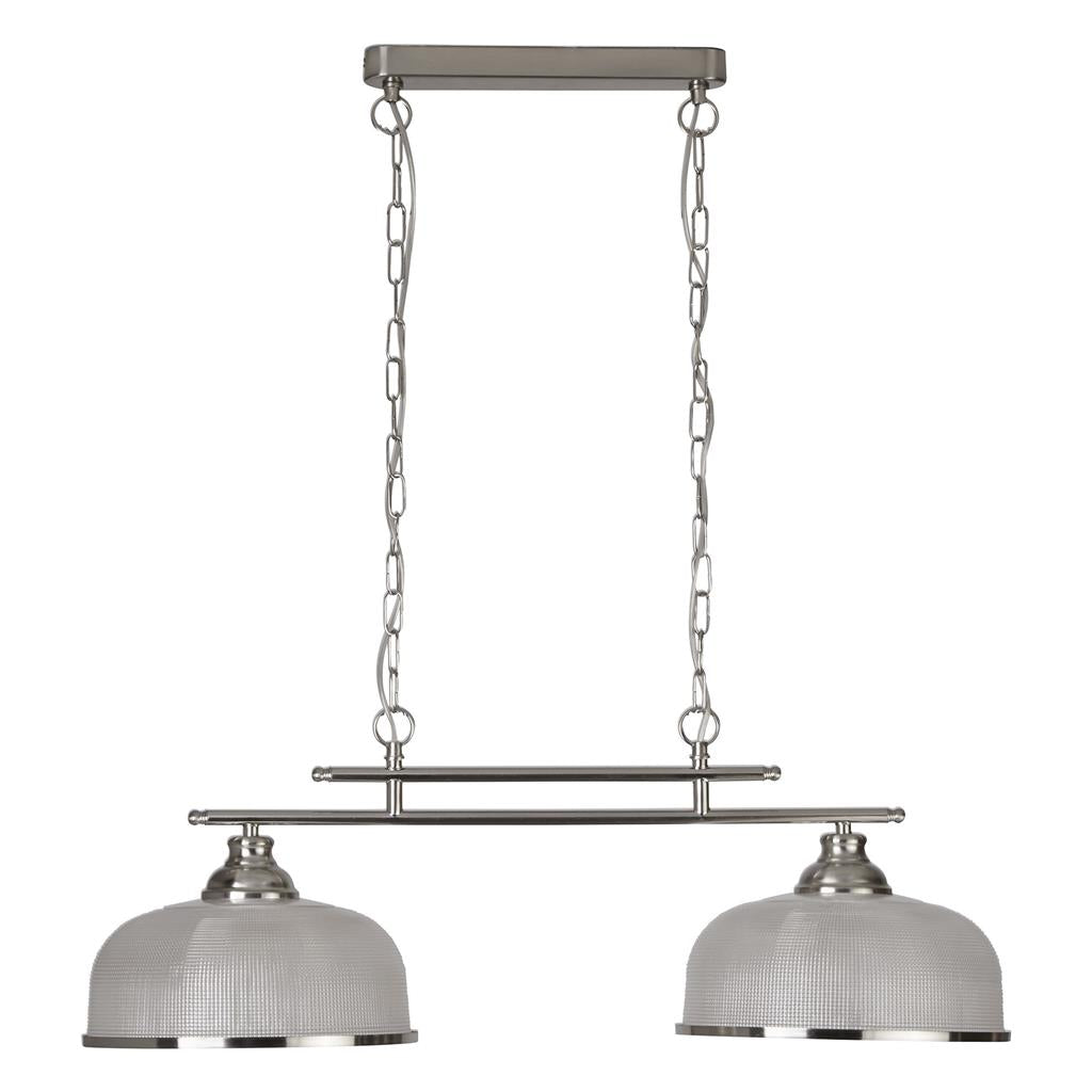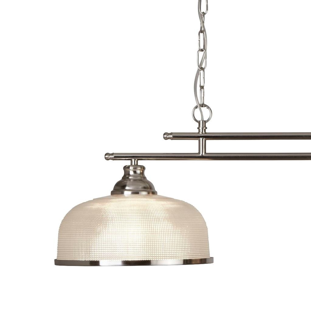 This Bistro satin silver 2 light ceiling bar pendant with acid glass shades has a simplistic look that will add a retro feel to any dining room or kitchen. Reminiscent of the style of classic diners and bistros, it comprises of two classic art deco shades positioned along a sleek satin silver finish bar, with acid glass to provide clean lighting effects. This ceiling bar light brings a distinctive and elegant style to any setting, and the chain can be adjusted for different ceiling heights.