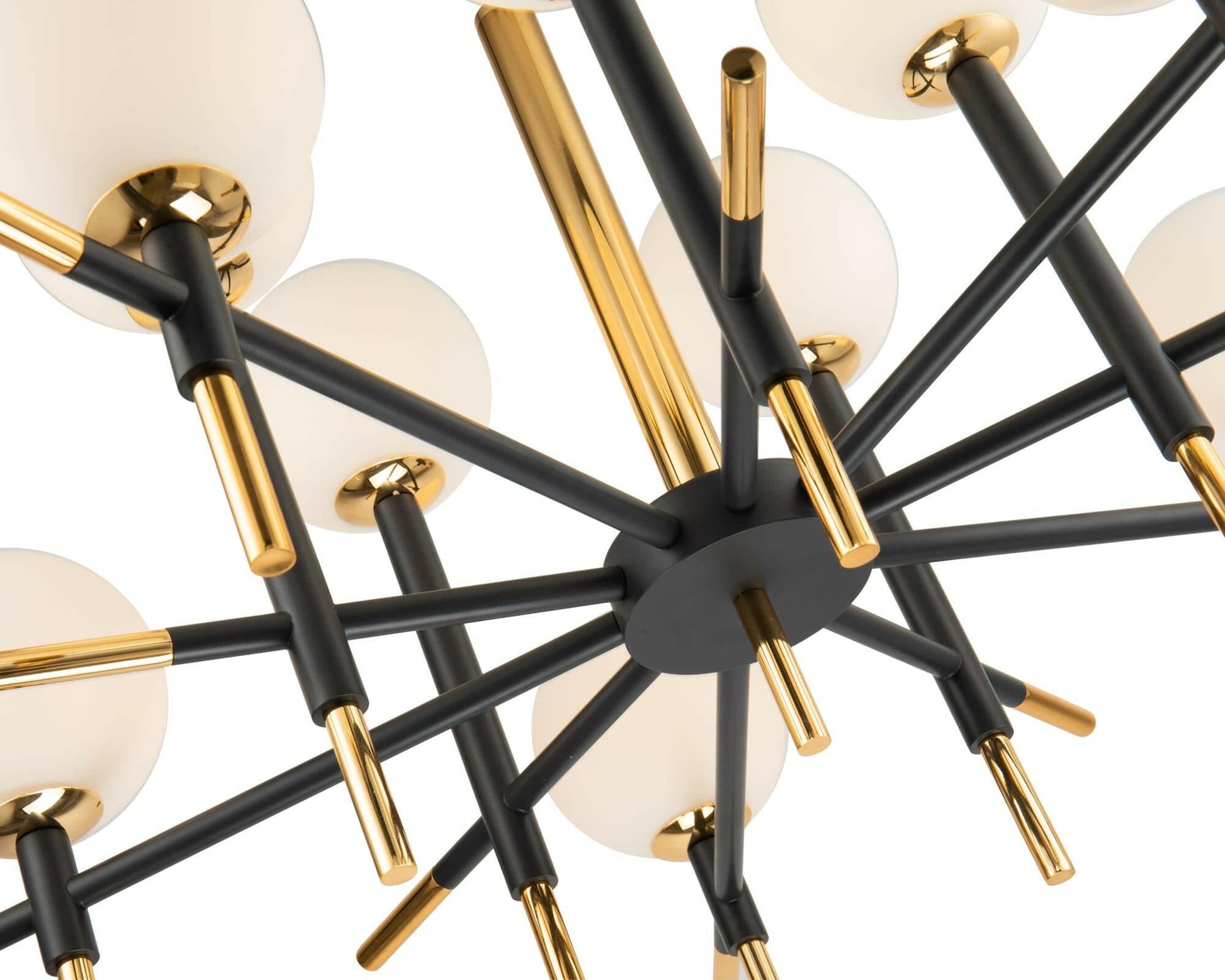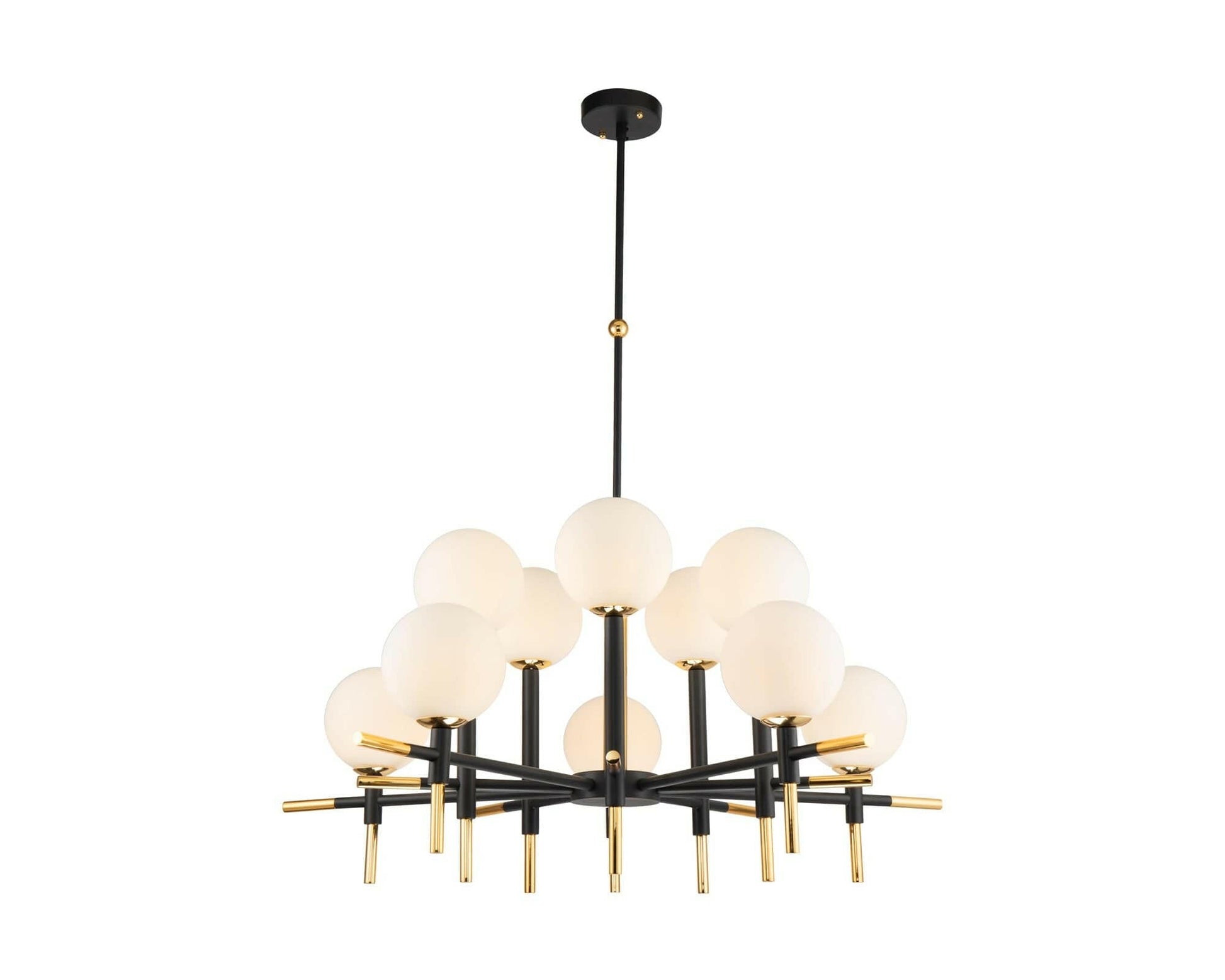 Enhance your interior with this Antique Black, Polished Brass Accents, White Glass Globe Shades Create a striking contrast in your interior piece, complete with the Boca Ceiling Lamp. Finished in antique black with polished brass tips, this ceiling lamp will create a sense of grandeur in any space. This lamp is height adjustable with the shortest suspended length at 300mm and the longest suspended length at 600mm. (Light bulbs is not included.. Requires 10 × LED G9 MAX 3W).