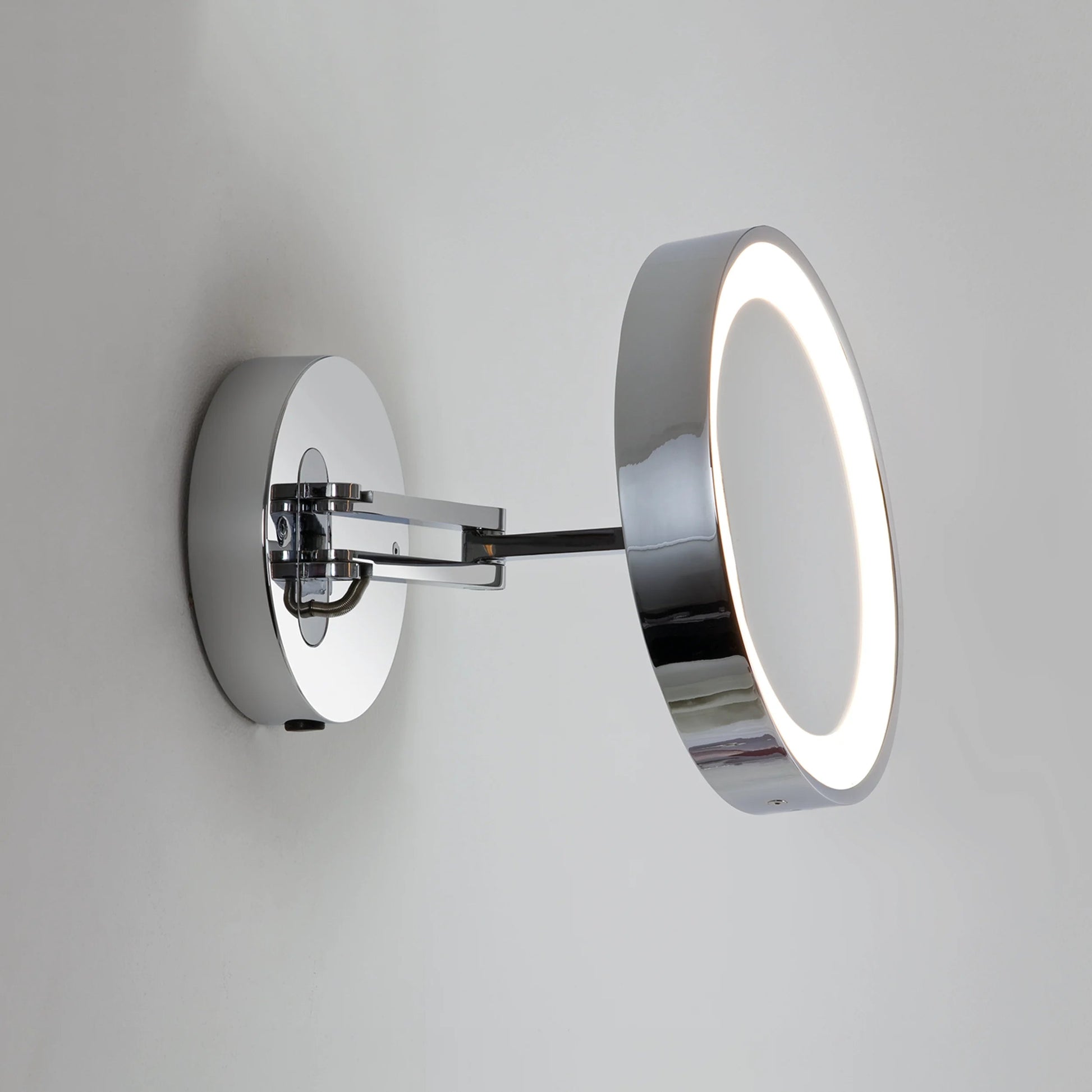 Our Catena LED magnifying mirror is our modern interpretation of a classic bathroom vanity mirror with a smooth, polished chrome frame and illuminated surround. It gives 5x magnification and bright, efficient light from various angles. Ideal for small spaces, it folds neatly against the wall when not in use.
