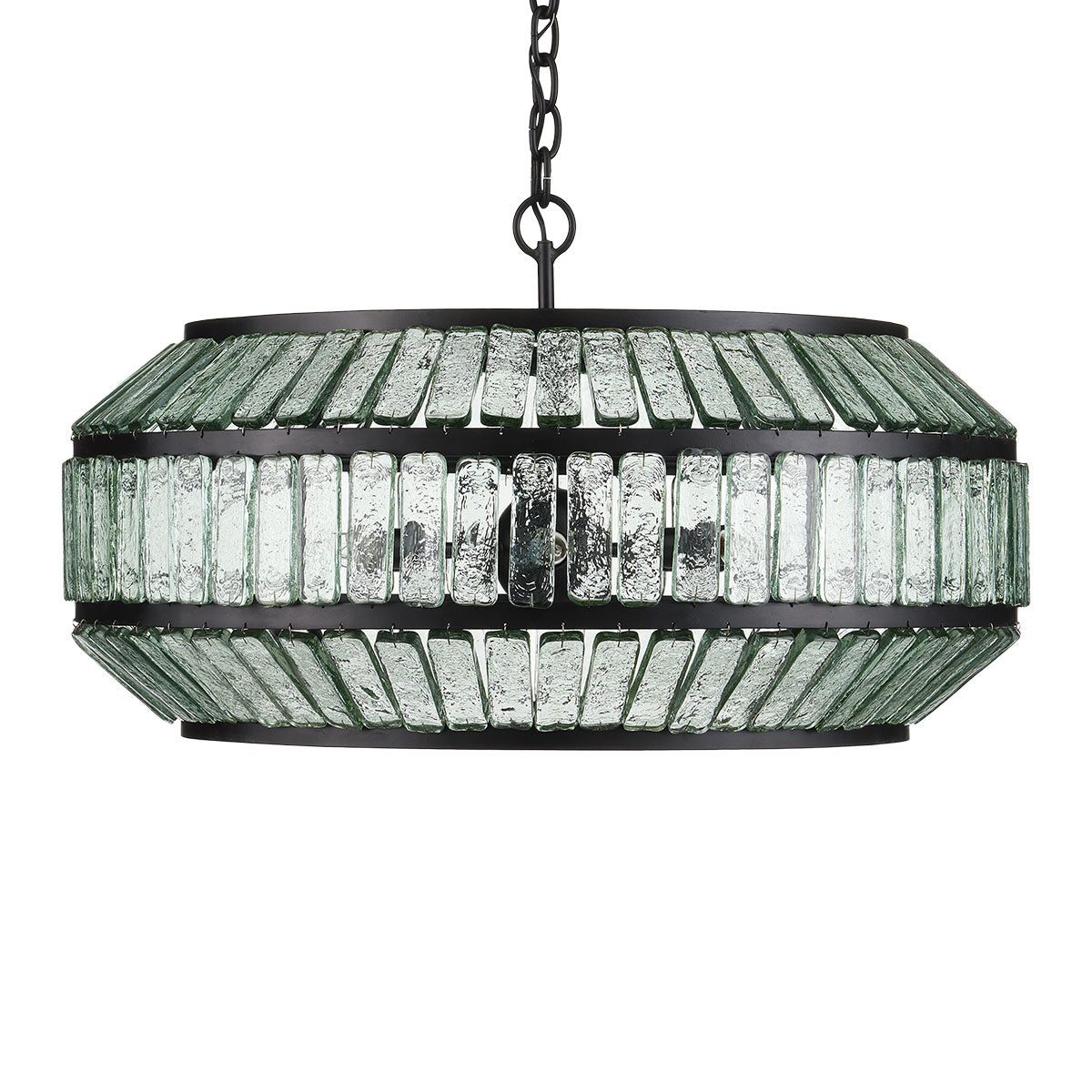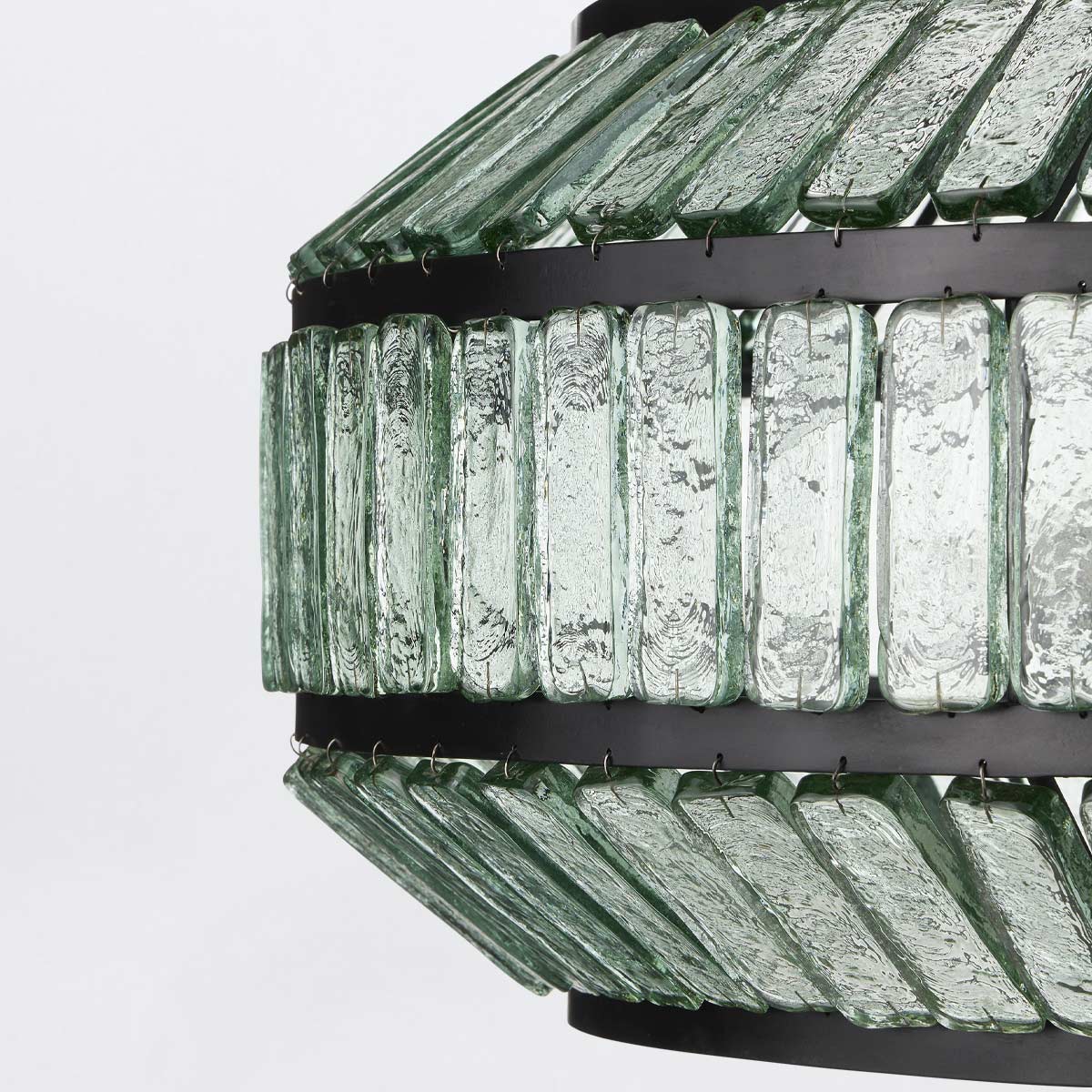 The Centurion Chandelier has elongated recycled glass panes that are unobtrusively fitted into wrought iron rings in a satin black finish. The thinness of the wire that fastens them makes this design feel streamlined and the wavy surfaces of the pieces of glass make it luminous. This black chandelier is stylistically suited to modern farmhouse, traditional, and transitional interiors. It hangs from an aircraft cable, which makes the design seem to float.