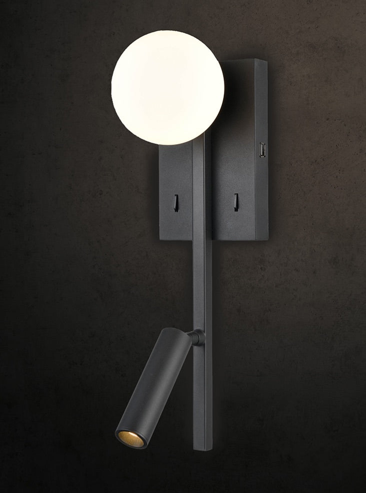 In matt black with an illuminated opal glass sphere. There are two switches and a USB port on the backplate.