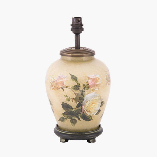 This hand-blown glass lamp is internally decorated with skilfully cut out images of old-fashioned Roses. The background is sponged gold backed by soft, off white paint. Recommended lampshade size: Cylinder 30cm diameter Recommended lampshade size: Empire 30cm diameter.
