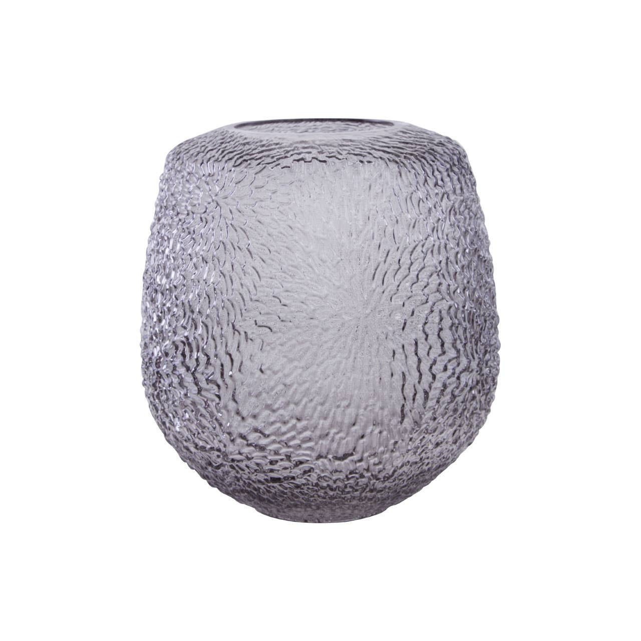The Colbie round grey glass vase with embossed detailing will add texture to a shelf or mantel.