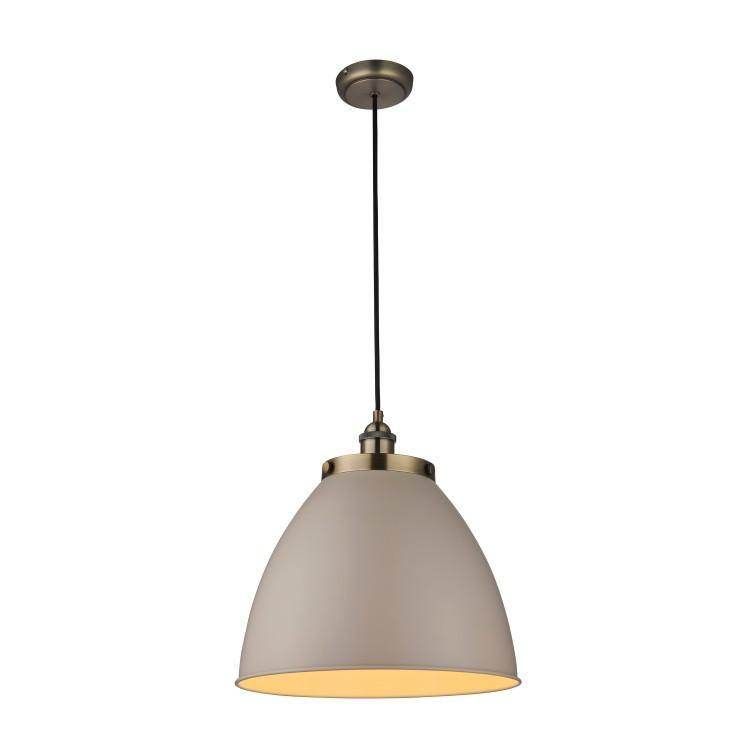 An authentic 'resto' style industrial pendant, finished in vintage stone colour paint with antiqued brass plated details. Suspended from height adjustable black fabric flex, pair with filament LED lamps for that perfect industrial style. The perfect addition for today's stylish homes to create that on trend bar, bistro look.