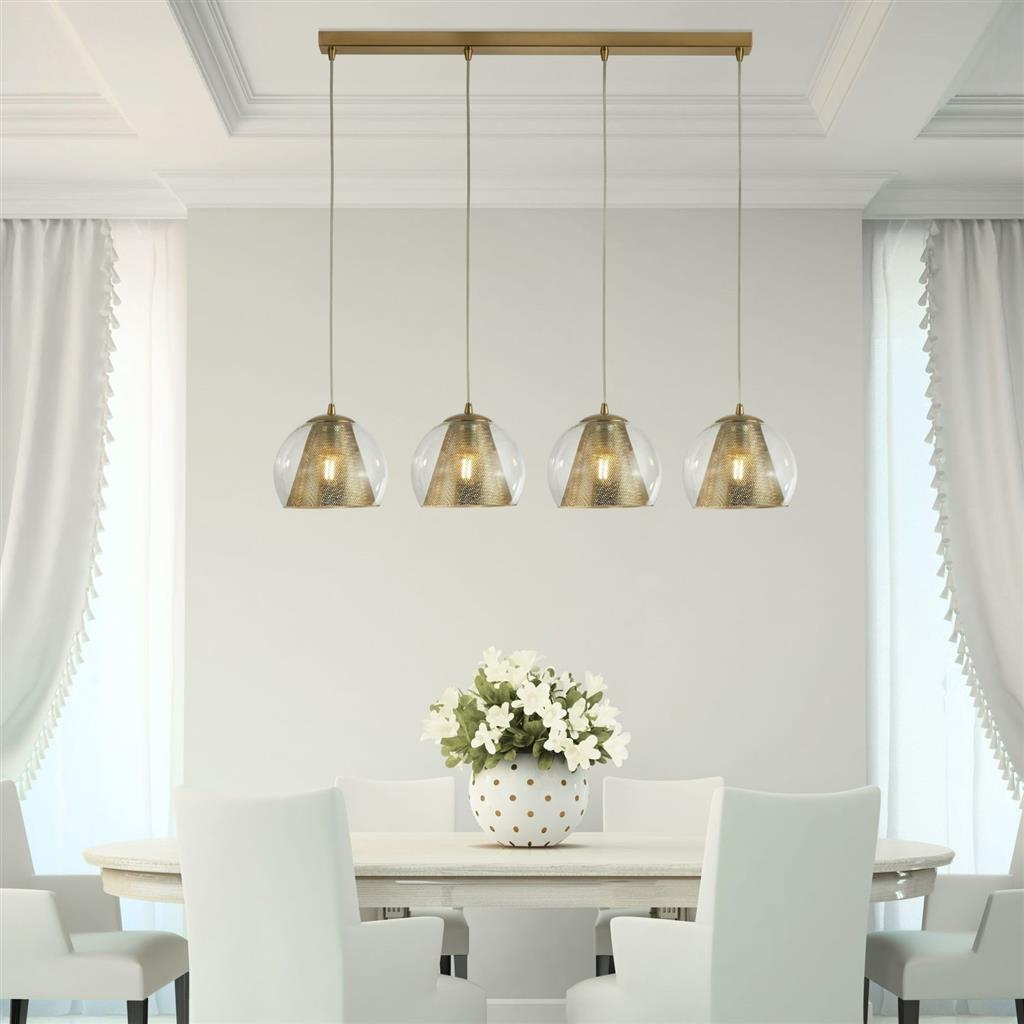 The bold design of the Conio 4 light pendant is great to add to a contemporary kitchen area. A clear glass ball shade is complemented with a mesh cone shape design and a satin brass finish. Allow the light to glow beautifully through this modern pendant.