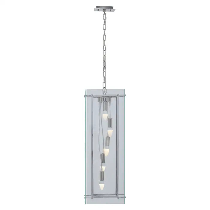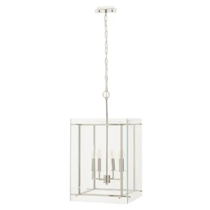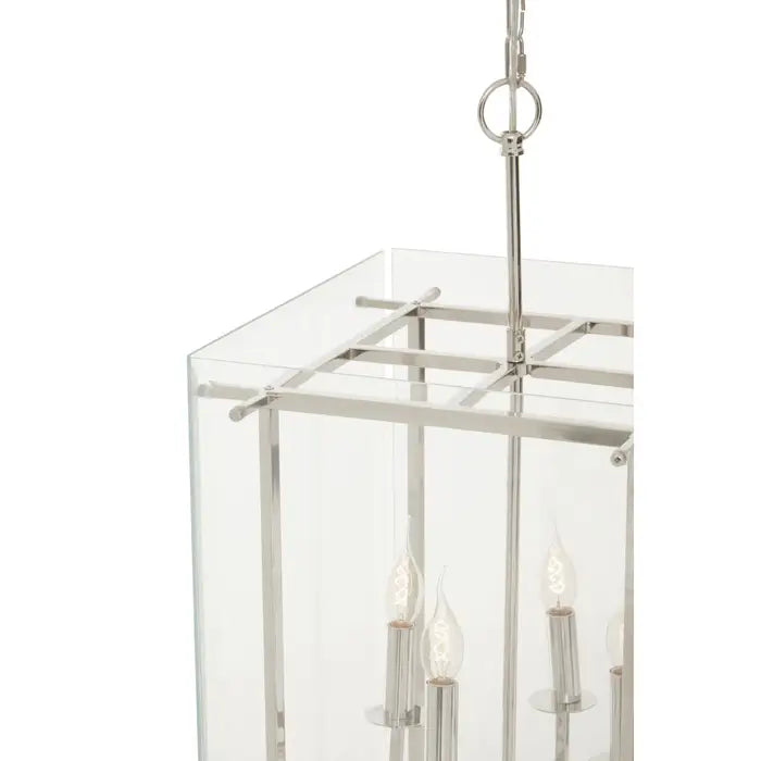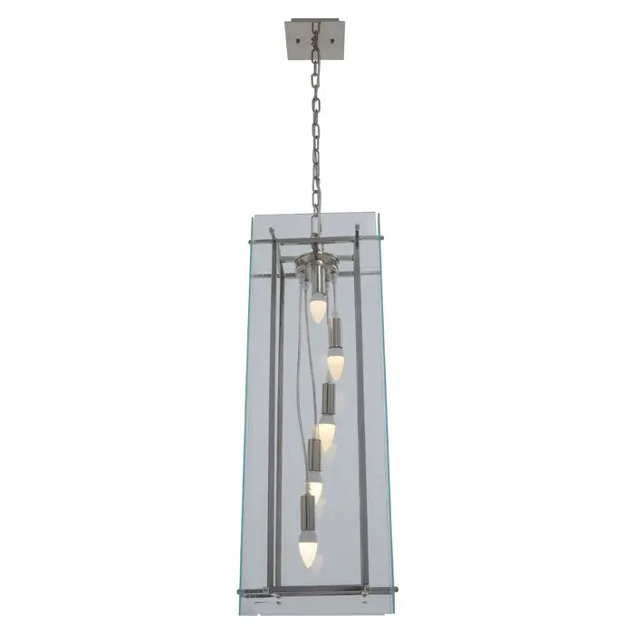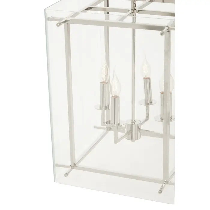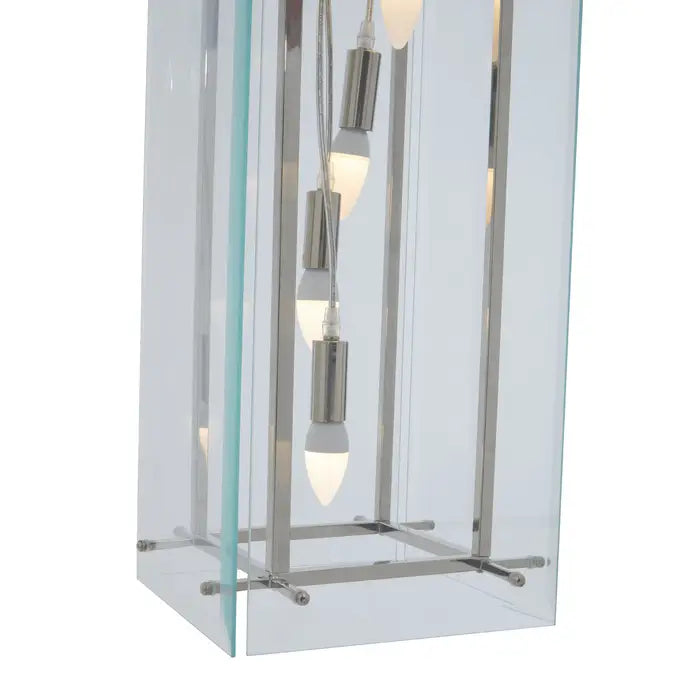 Boasting a slim and box-shaped fixture, this four and five bulb pendant light creates visual intrigue. The nickel finish metal frame in rectangular shape is encased in a clear glass shade which maximises its value to cast an industrial look and cosy ambience.