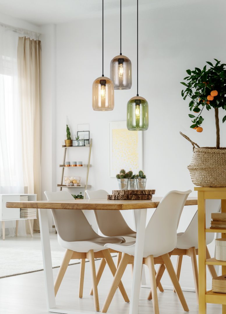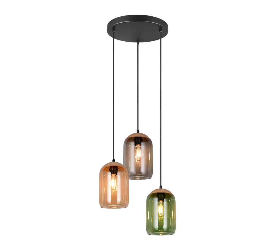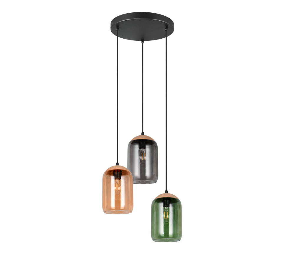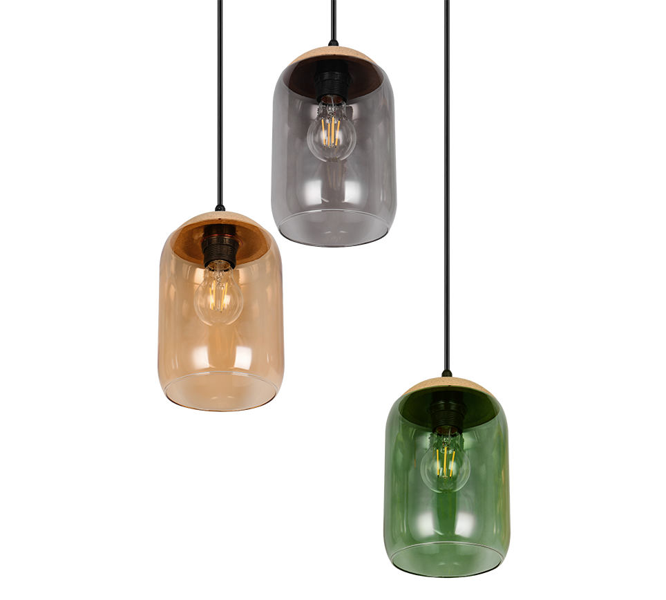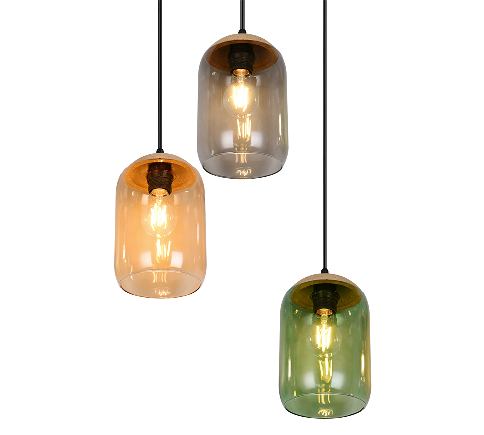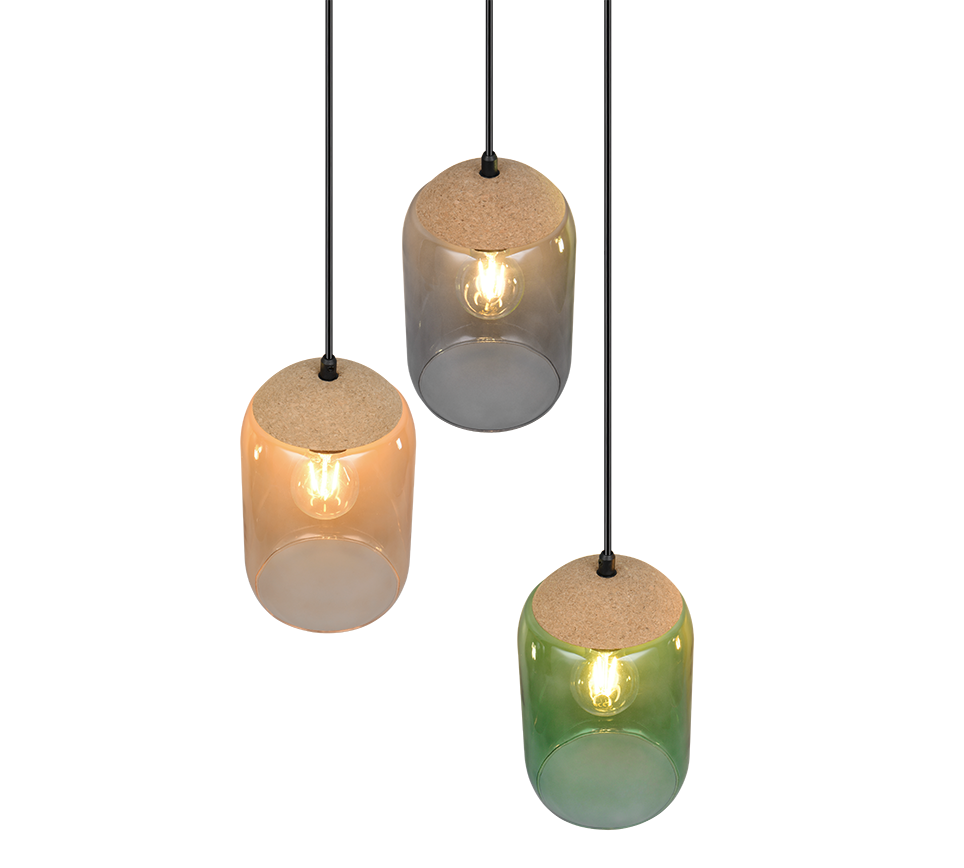 A fascinating interplay of light and sustainability - our three-light CORK pendant light is the perfect centrepiece. The harmonious combination of recycled glass and cork brings the colours of life to life. With its aesthetic appearance, it integrates perfectly into your living and dining area and creates a cosy ambience with warm colour tones. Its colour palette of green, amber and smoke creates a feeling of connection with nature. The use of the material mix of cork, glass and metal reinforces this feeling of nature and gives the room a harmonious balance between naturalness and modern design. The use of LED light sources is recommended for energy-saving lighting. These are an ideal alternative to conventional halogen light sources and offer high light quality and energy savings of up to 80%. With LED light sources, you also benefit from a long service life and low heat generation while protecting the environment.