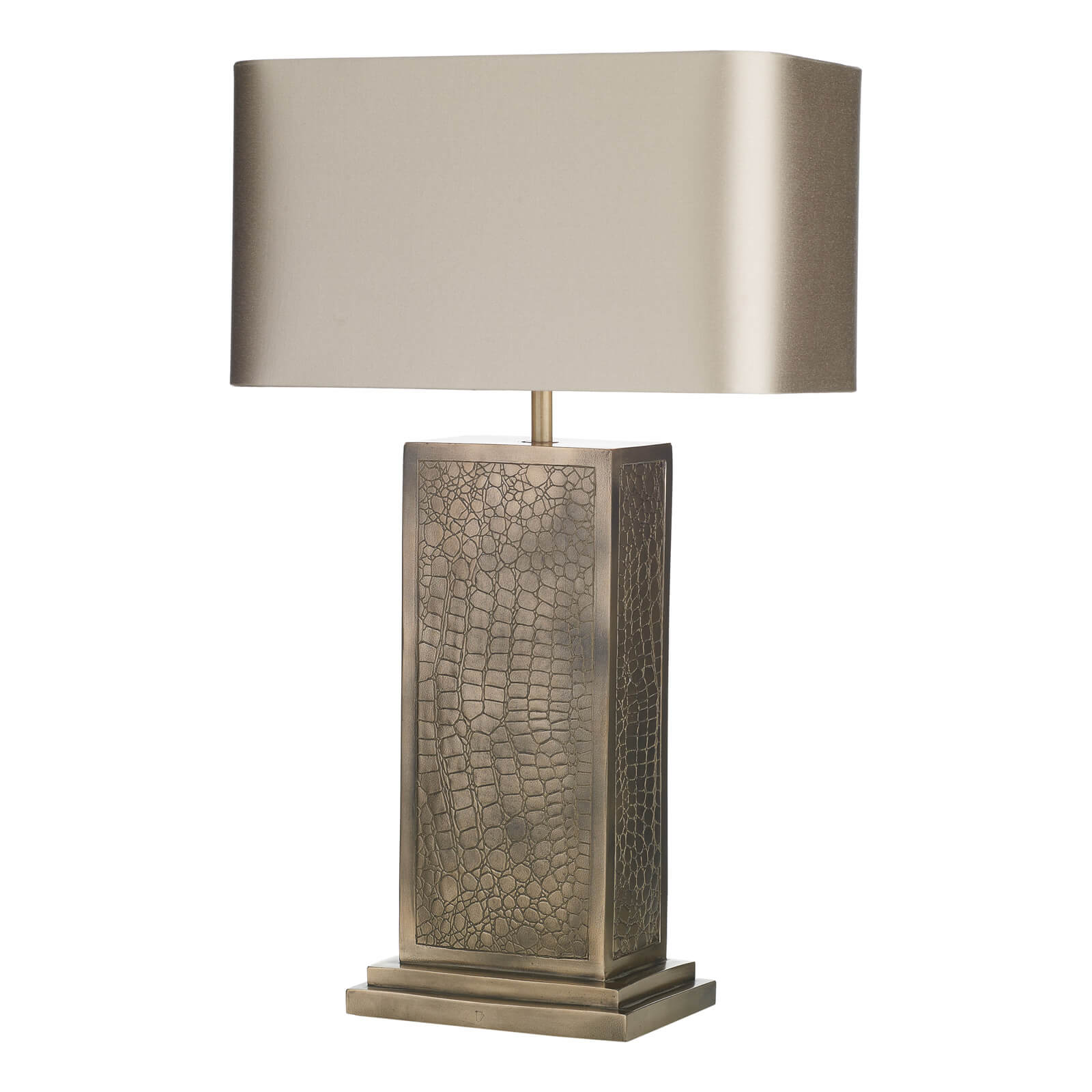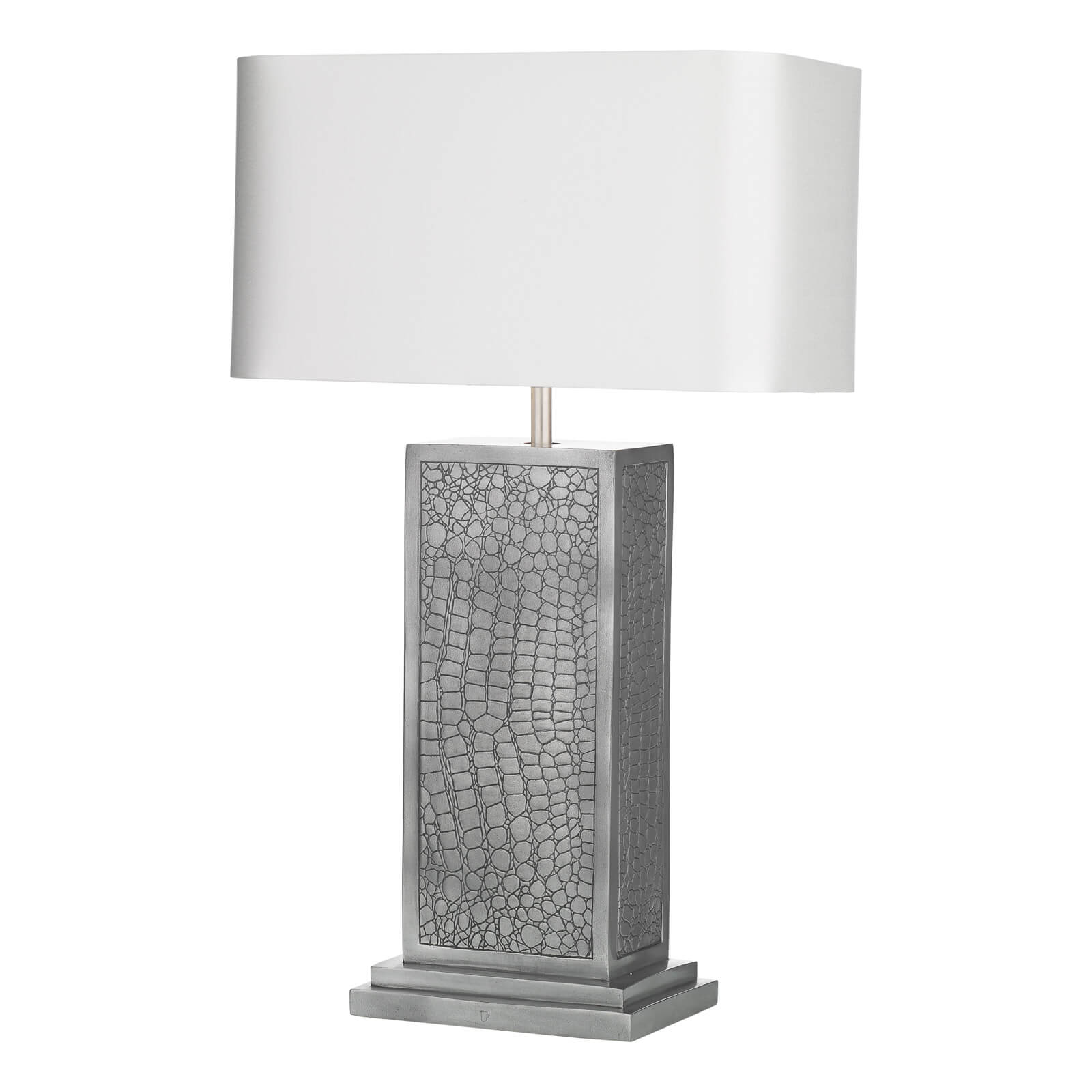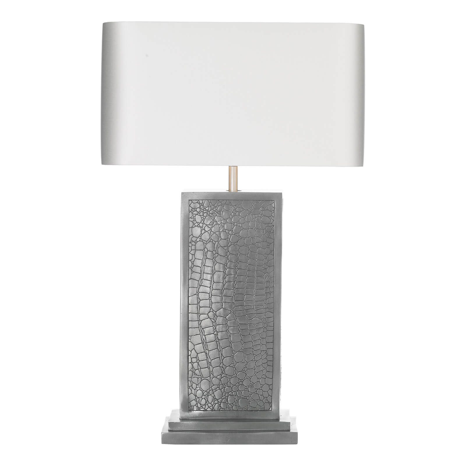 Croc table lamp with resin pewter casting set in a matching framework and base. Complete with silk shade.Shown here with our Swan satin shade.Please specify outer shade and lining colour at the time of ordering.Ourshades aremanufactured by our sister brand The Light Shade Studio. Shades areavailable to order from our extensive palette of luxurioussilk dupions, silk linens and smooth satin fabrics.Please specify outer shade when ordering.Our bespoke or customised light fitting items are not covered by our standard returns policy. These are 'made to measure' light fittings that are made to your individual requirements and cannot be resold by us. We will work with you and do our utmost to make sure you are 100% satisfied with your order before your light is made, but regret we are unable to offer refunds on bespoke fittings after the initial 24 hour cooling off period. (None of the above affects your statutory rights where goods are faulty or not as described).We recommend the use ofLED lamps (see BUL/ E27/LED/16 ) with this table lamp, to be ordered separately.