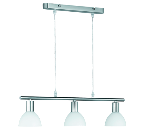 The modern three-light DALLAS pendant light impresses with its timeless elegance. With its pleasant light and decorative lamp glass, this very modern pendant light is a real eye-catcher and brings a special atmosphere into your room. With a height of 120 cm and a width of 61 cm, it fits well above any dining table. However, it can also provide the perfect light for the workplace. The matt nickel colour scheme combined with the opal white glass creates a sophisticated and elegant effect. For energy-saving lighting, it is recommended to use an LED illuminant. These are an optimal alternative to conventional halogen lamps and stand for a high quality of light and energy savings of up to 80%. In addition, LED lamps help you benefit from a long service life, low heat generation and at the same time protect the environment.