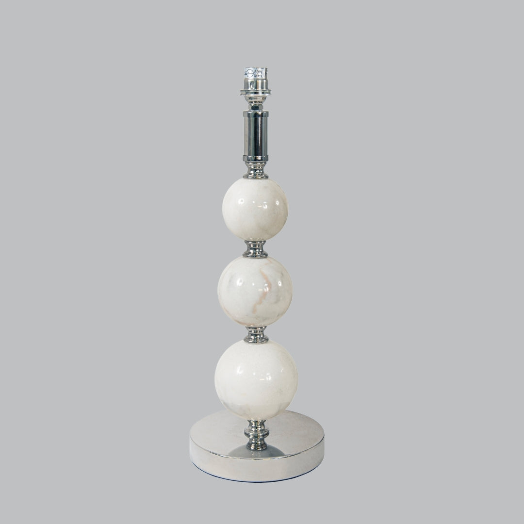 Dante is a sleek table lamp base, ready to customise with your choice of shade. Its design, featuring three white marble spheres, suits modern interiors. Perfect for bedsides or desks.