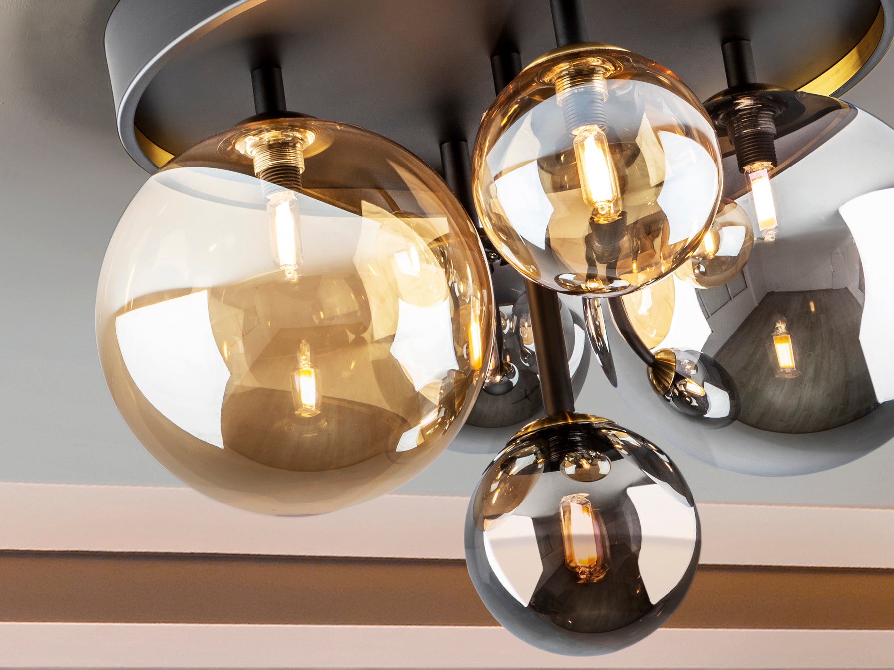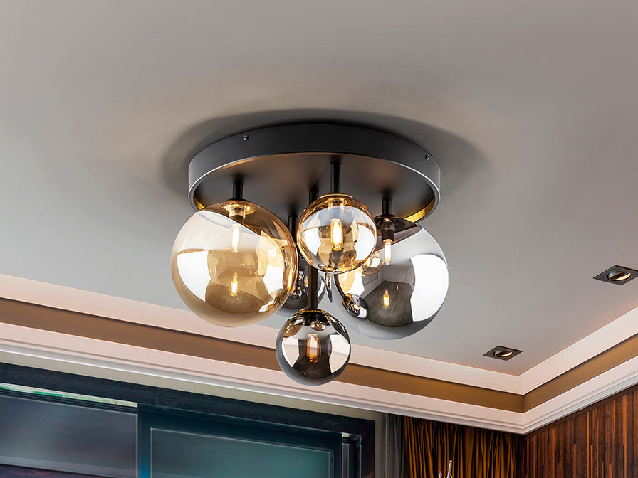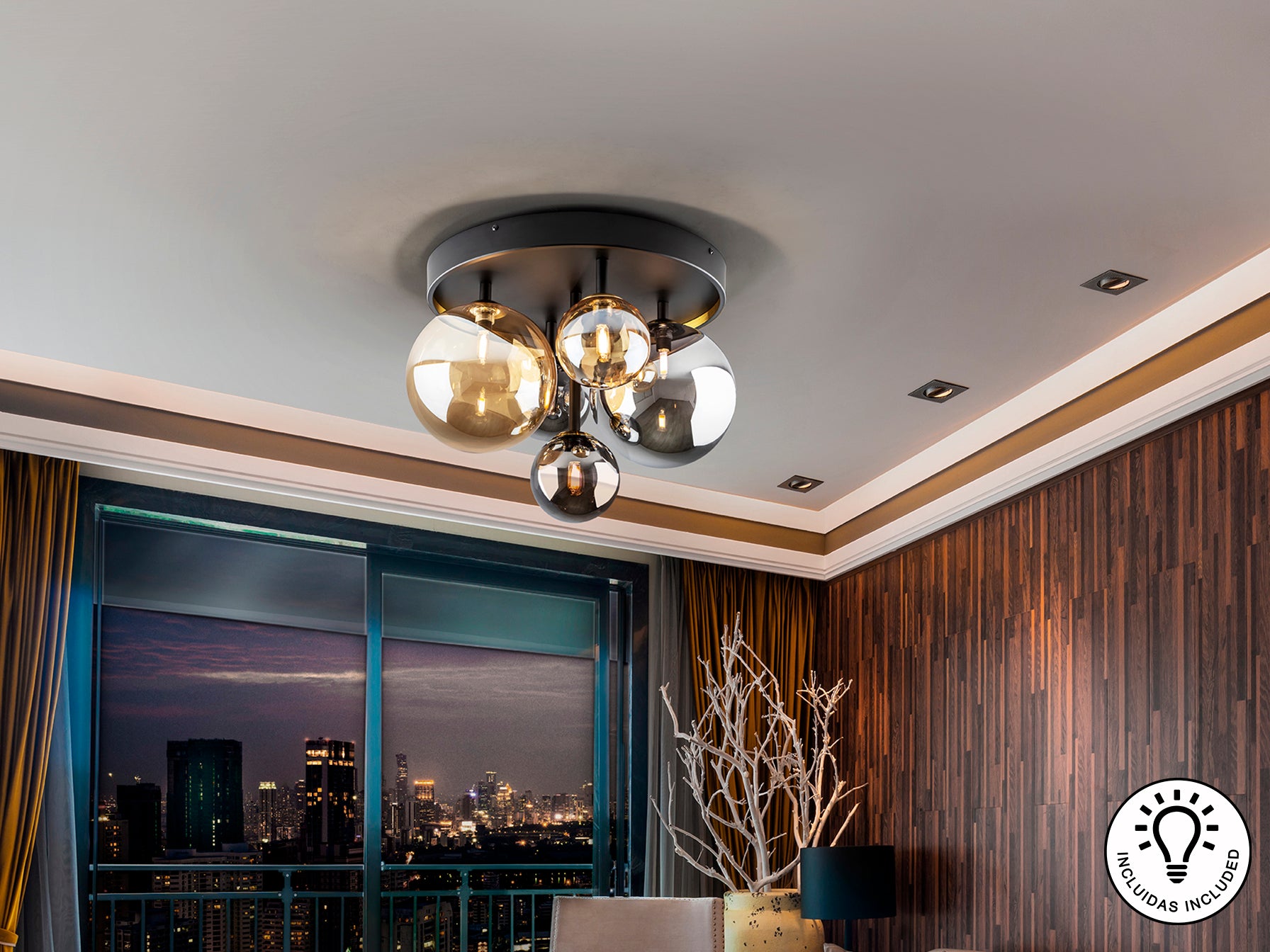 Ceiling lamp with 5 lights made of metal, finished in matt black with satin brass details. Features spherical glass shades of 12 cm and 20 cm in amber and mirrored smoke grey finishes. This item includes 5 × G9 LED 4W. Supplied with GRAVITY TOGGLES to improve ceiling fixing. 110v version available.