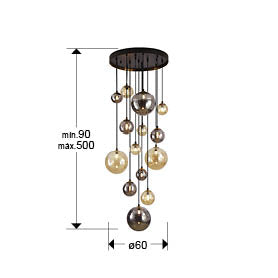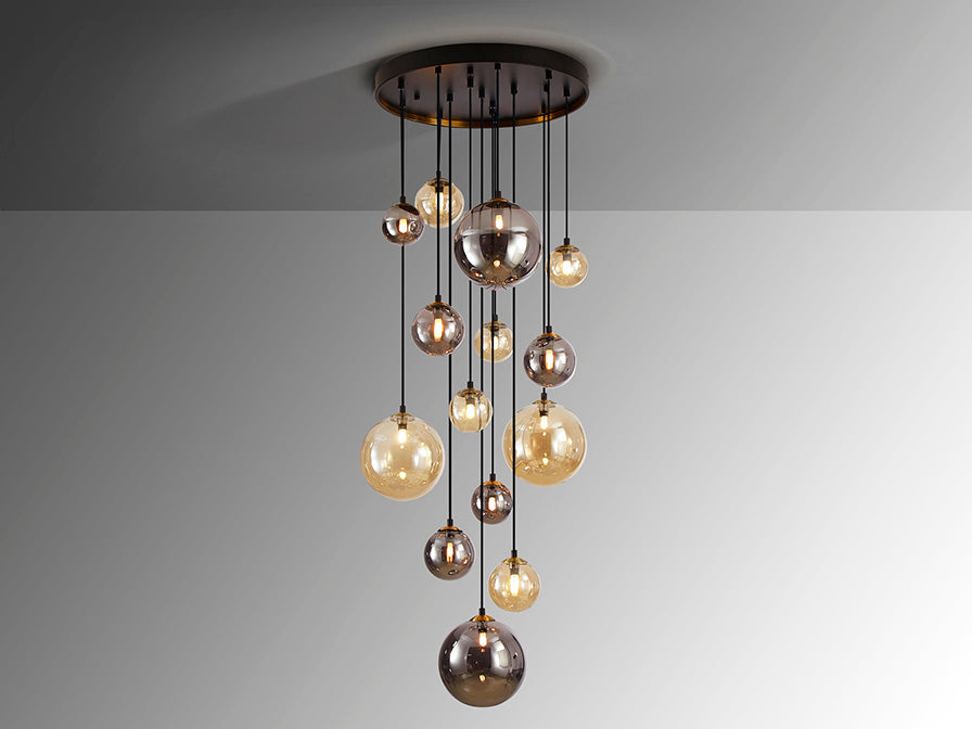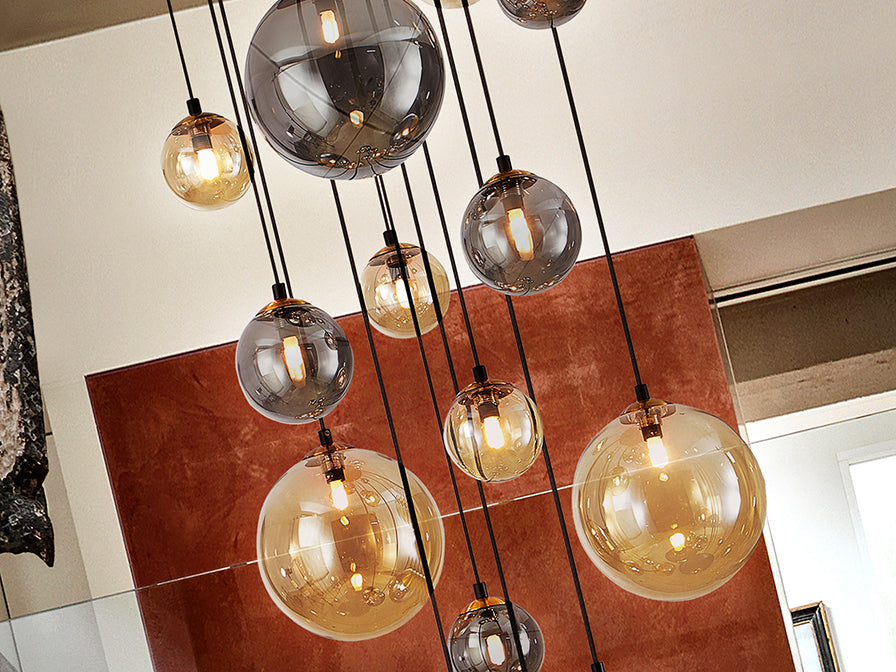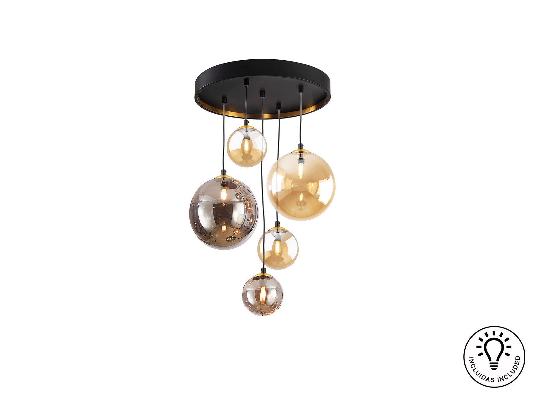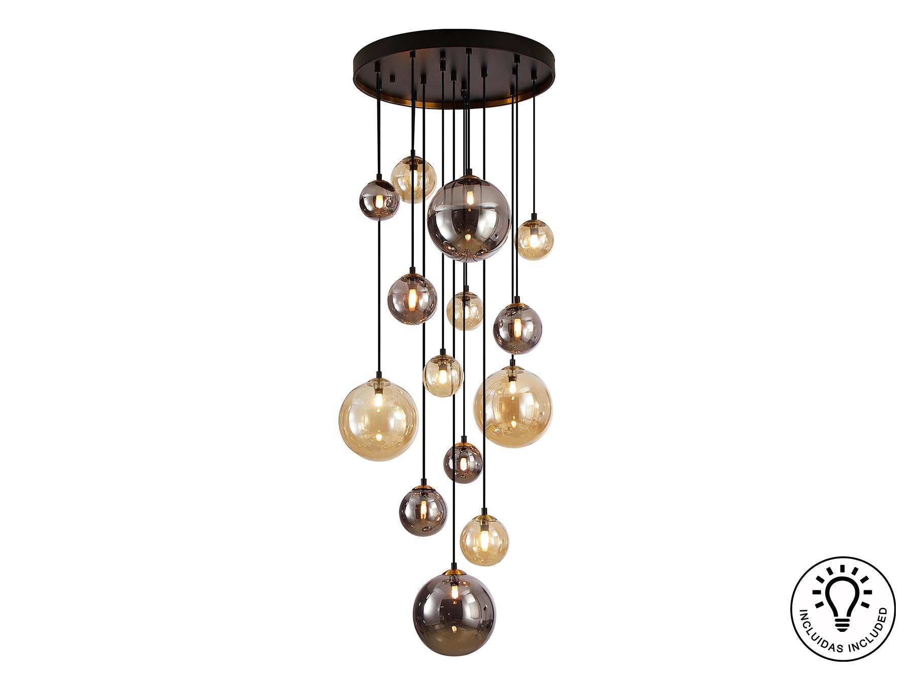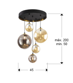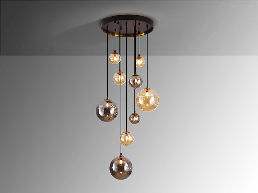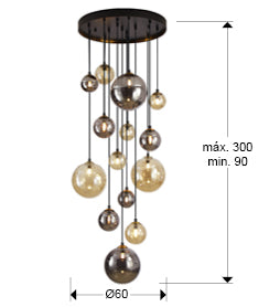 Lamp of 9 lights made of metal, finished in matt black, with details of satin brass. Spherical glass shades of 10, 12 and 20 cm finished in amber and shimmered smoke grey. Adjustable in length.