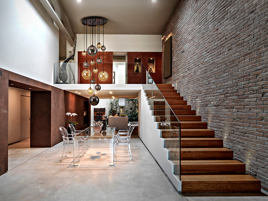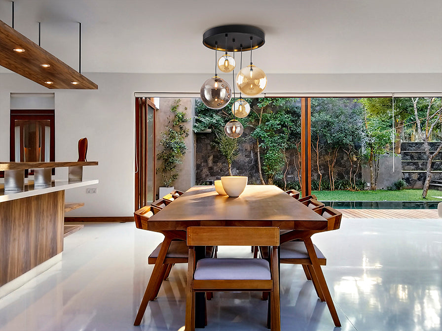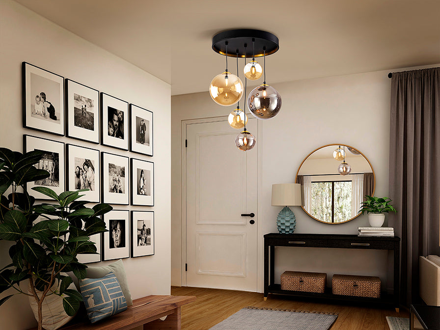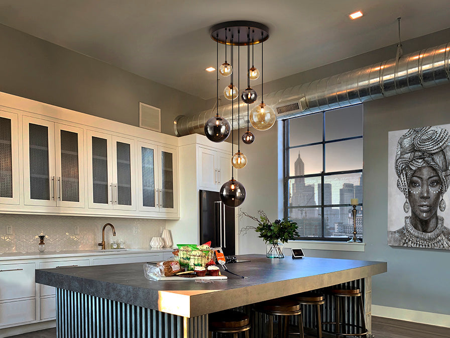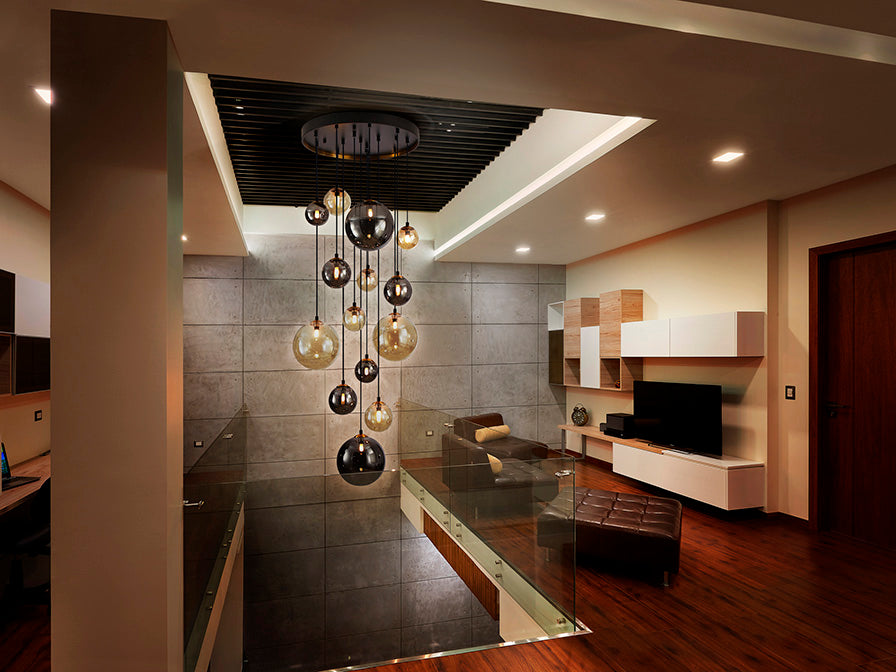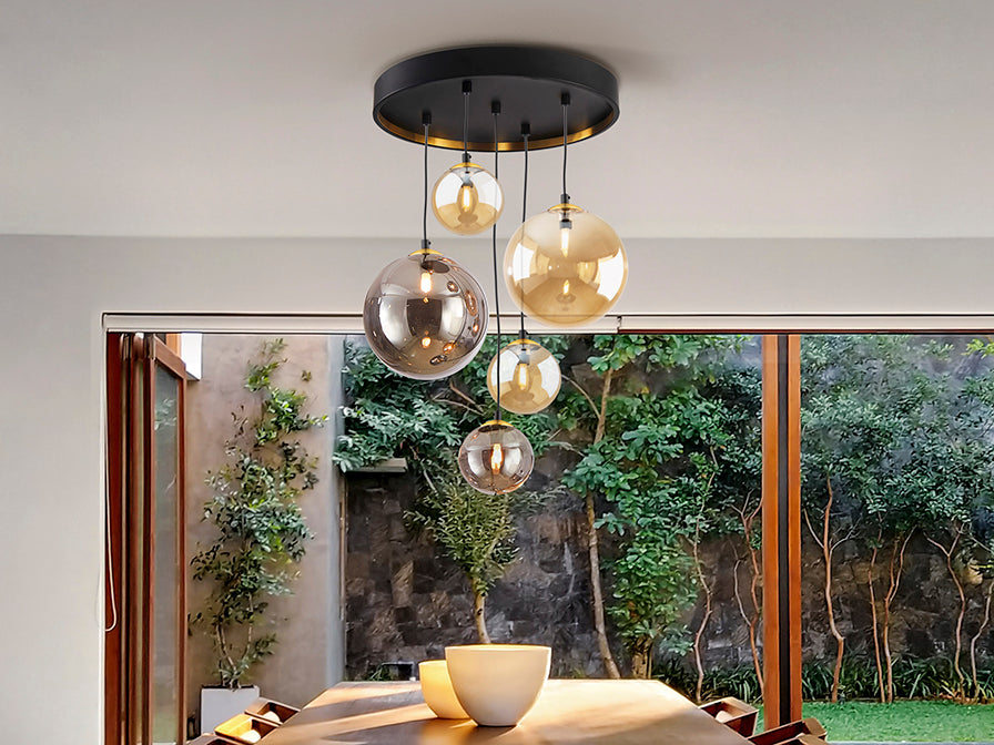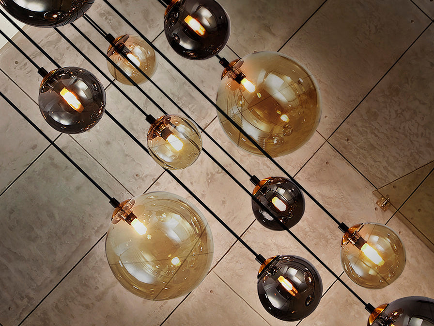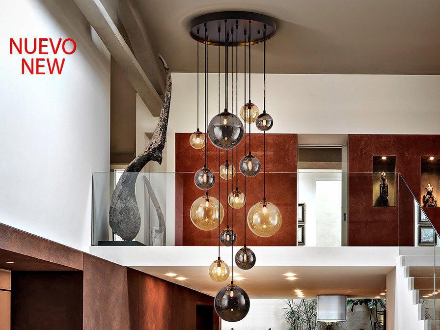 Lamp of 9 lights made of metal, finished in matt black, with details of satin brass. Spherical glass shades of 10, 12 and 20 cm finished in amber and shimmered smoke grey. Adjustable in length.