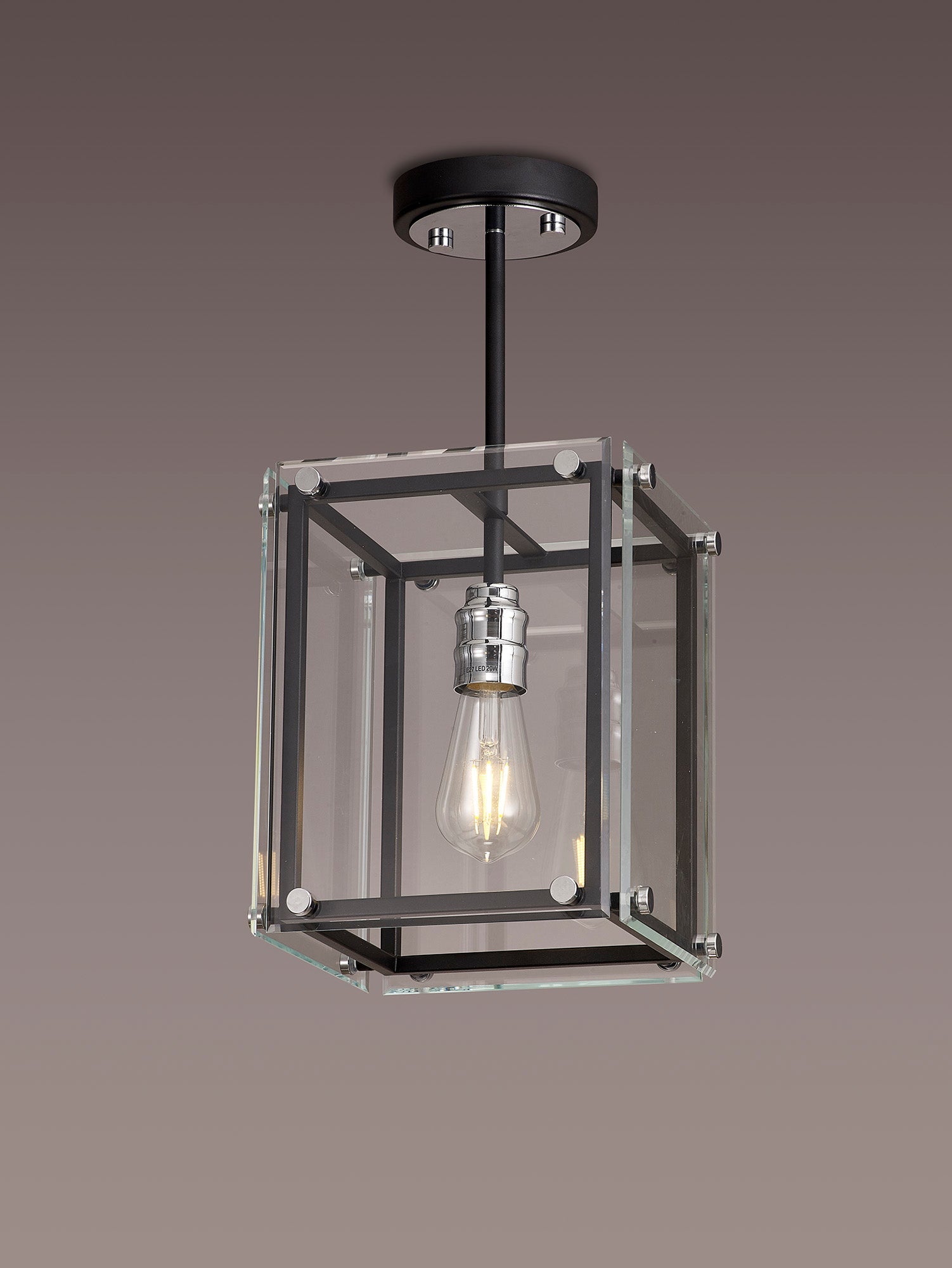 Delhi is a contemporary range of square glass pendants with complementing flush and semi flush fixture. The intricate design details of this range see the matt black colour finish accentuated by the polished chrome components. This added attractive, contrasting detail applies a modern twist to an otherwise traditional concept; suitable for a wide range of settings. The open spaces between the framework are filled with high quality clear glass panes to further reflect the light from the E27 lamp holders.