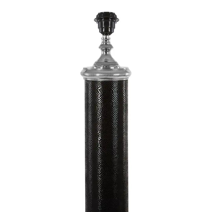 This stylish table lamp's combination of tactile black leather and etched metal creates a sophisticated and minimalist look. Shade not included.