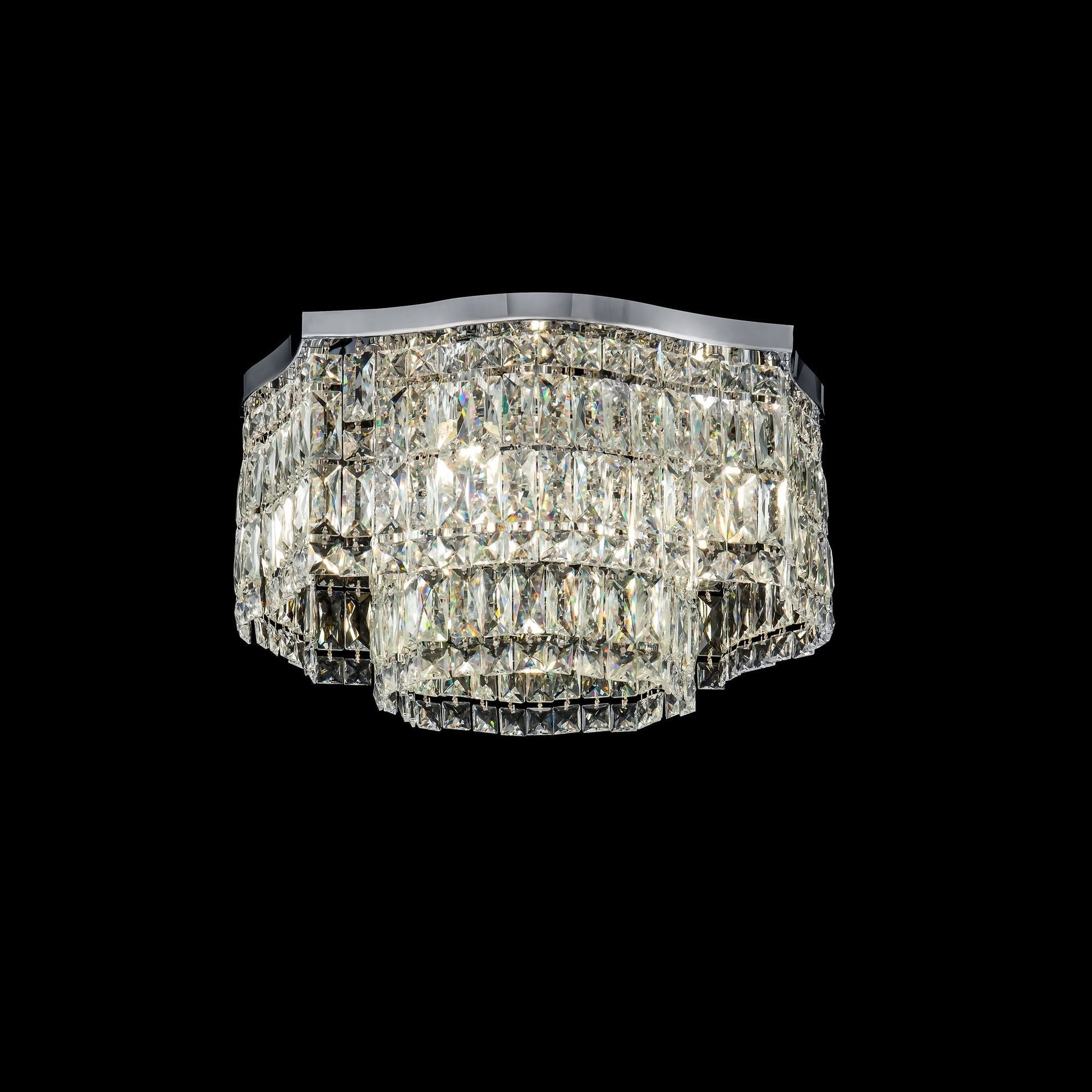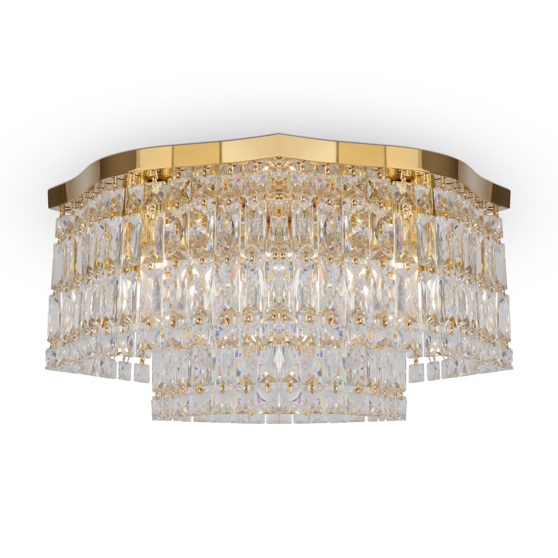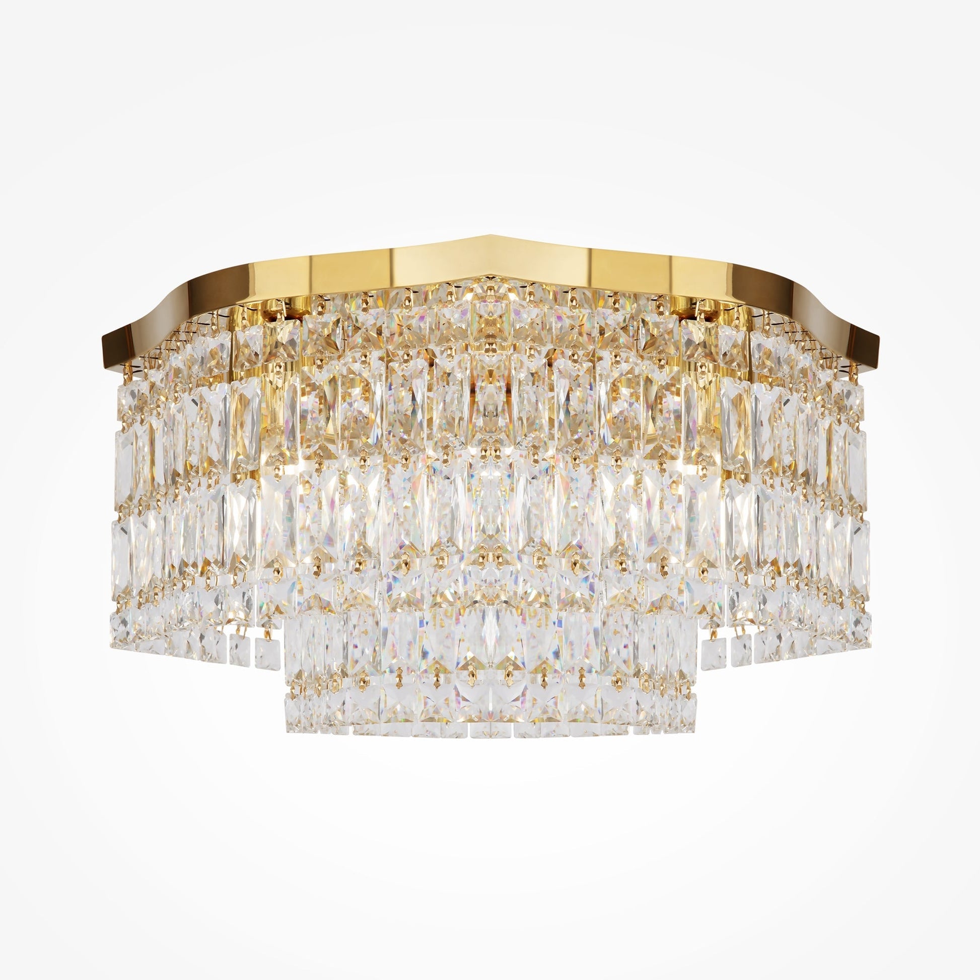 Metal fittings in two colours: chrome, gold. Decorative elements— clear crystals. Ceiling models have two tiers of pendants. Height of the pendant chandelier is adjustable using cable.