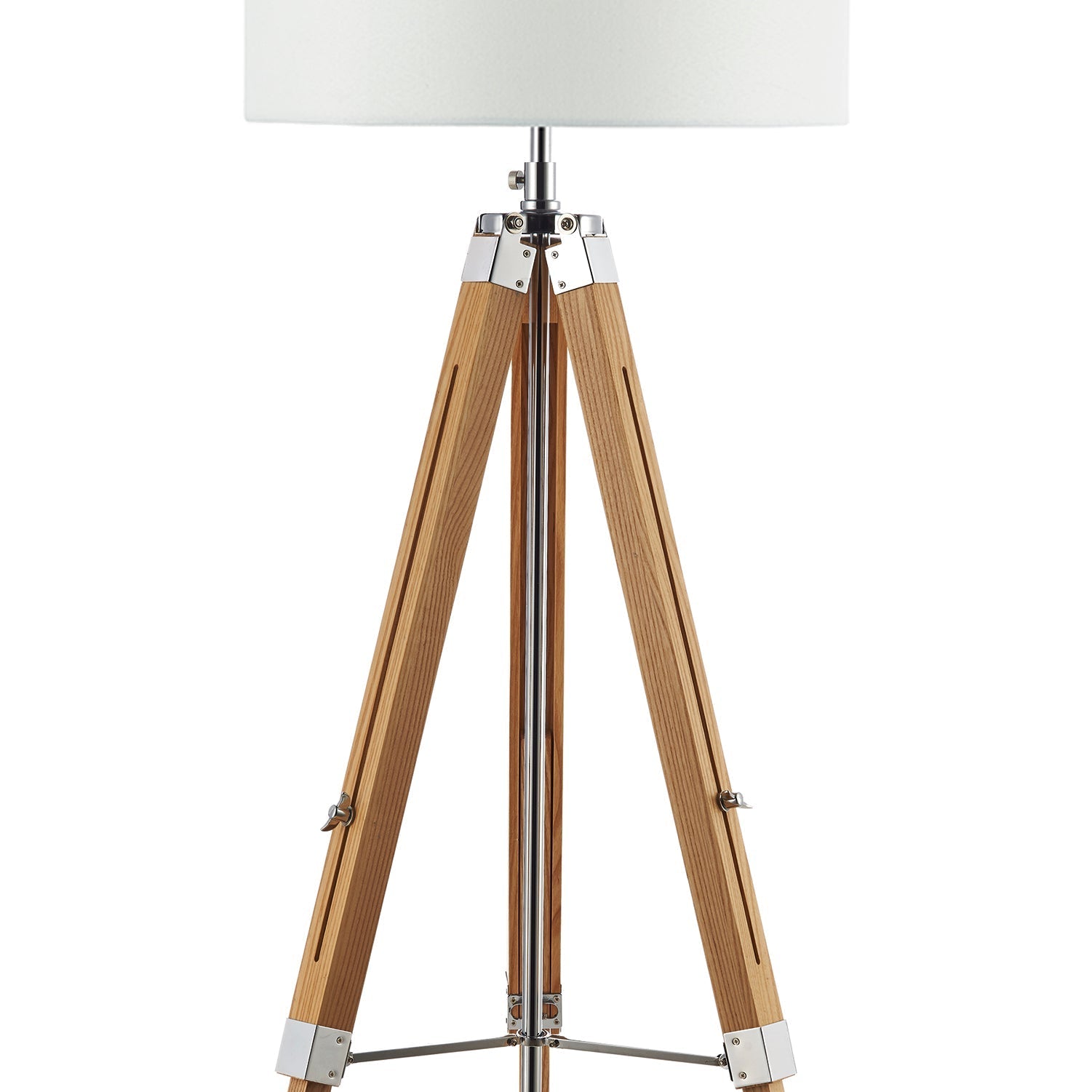 The height adjustable tripod base of the EASEL 1lt Floor Lamp base is finished in light wood with polished chrome trim.