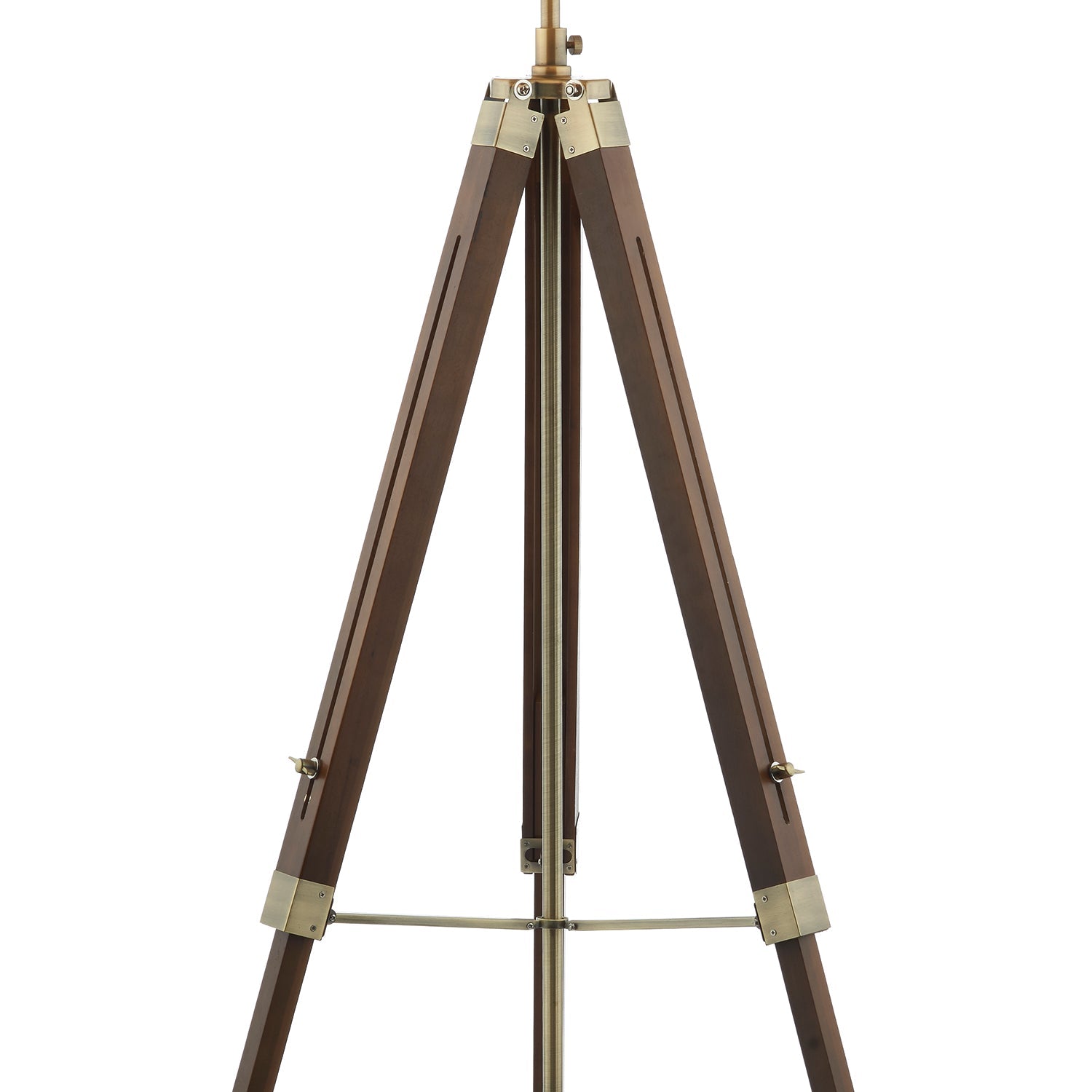 The EASEL 1lt Floor Lamp base has an adjustable tripod base finished in dark wood and antique brass accents, and is foot switched.