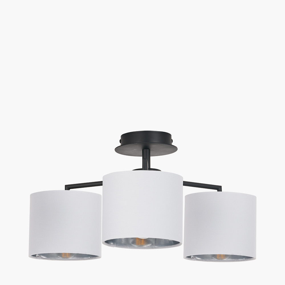 The Elin 3 Light Electrified Pendant is finished in a striking matt black and complemented by 3 faux cotton ivory shades. The metallic lining allows the light to shimmer when lit. This semi flush pendant is a sophisticated addition to any ceiling.
