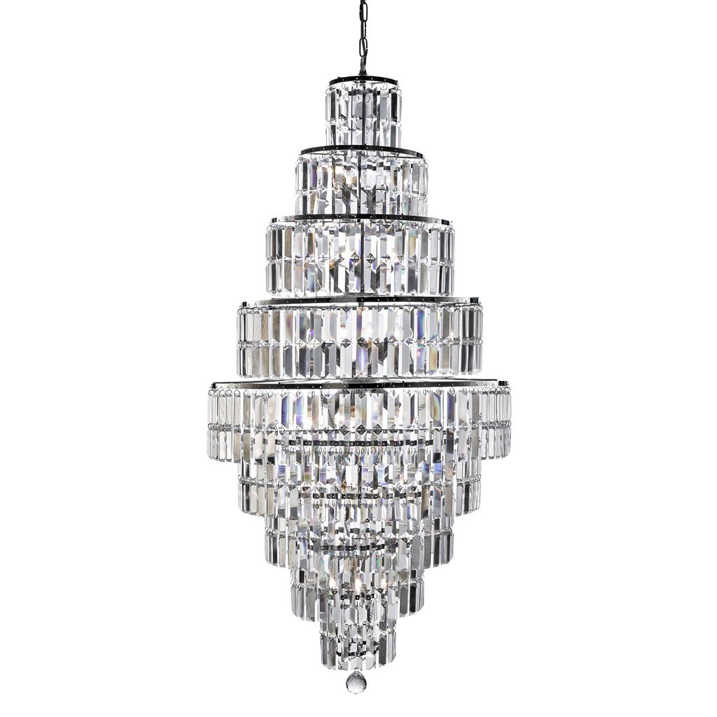 Empire is a spectacular, glittering 13 light tiered chandelier with stunning rectangular crystal prisms hanging symmetrically from a modern, chrome finish frame. Create a scintillating, jewellery-like effect with this impactful piece as the main feature in your living area or dining room. It is a breathtaking centrepiece that effortlessly combines elegance and functionality. With its 13 lights, stunning clear crystal glass pieces which will reflect the light beautifully when lit, and chrome metal detail, it is designed to create a captivating lighting experience that will transform any space.