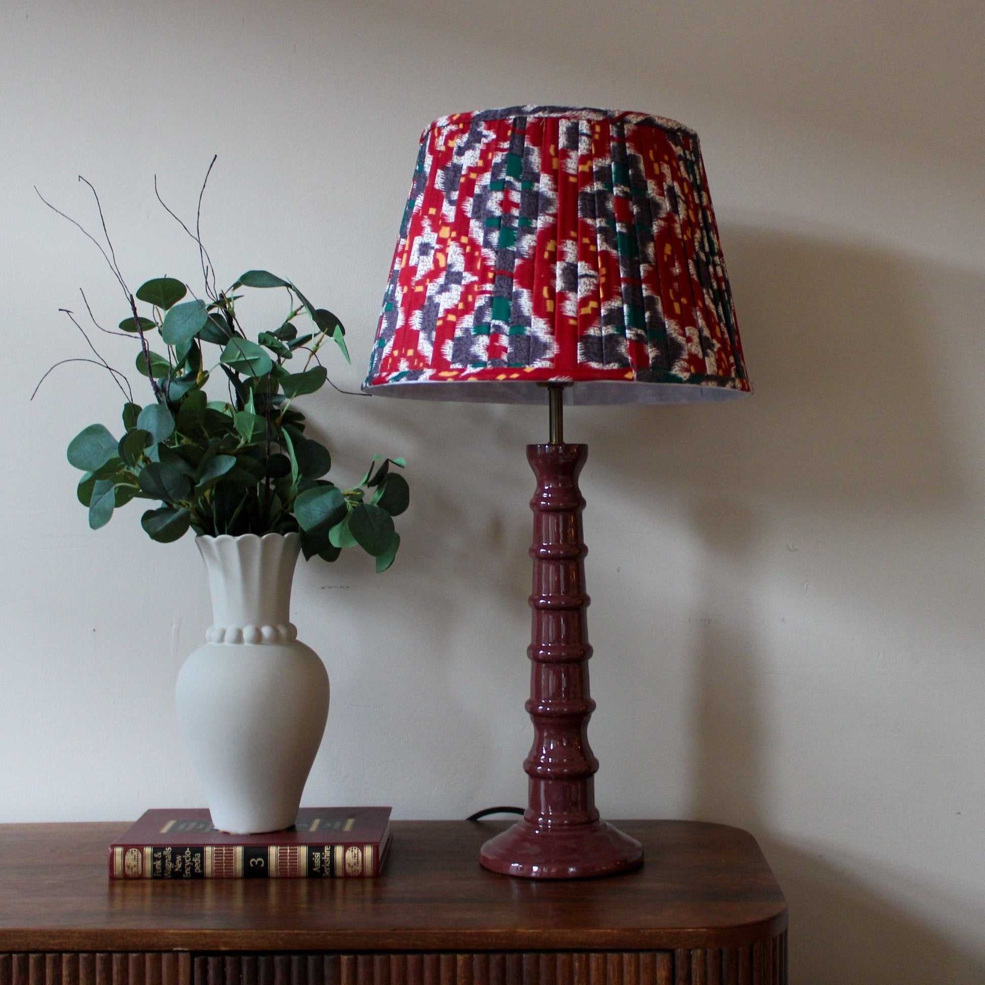 Enrich your home with our stunning burgundy enamel table lamp topped with a beautiful red and blue pleated shade. This profoundly warm and cosy table lamp will add a real sense of style to your home with colour, texture and detail perfectly in balance. The base is tactile to the touch with circular ridges which complements the pretty pleating of the shade. A lovely lamp ideal for a living room, bedroom, dining room or hallway.
