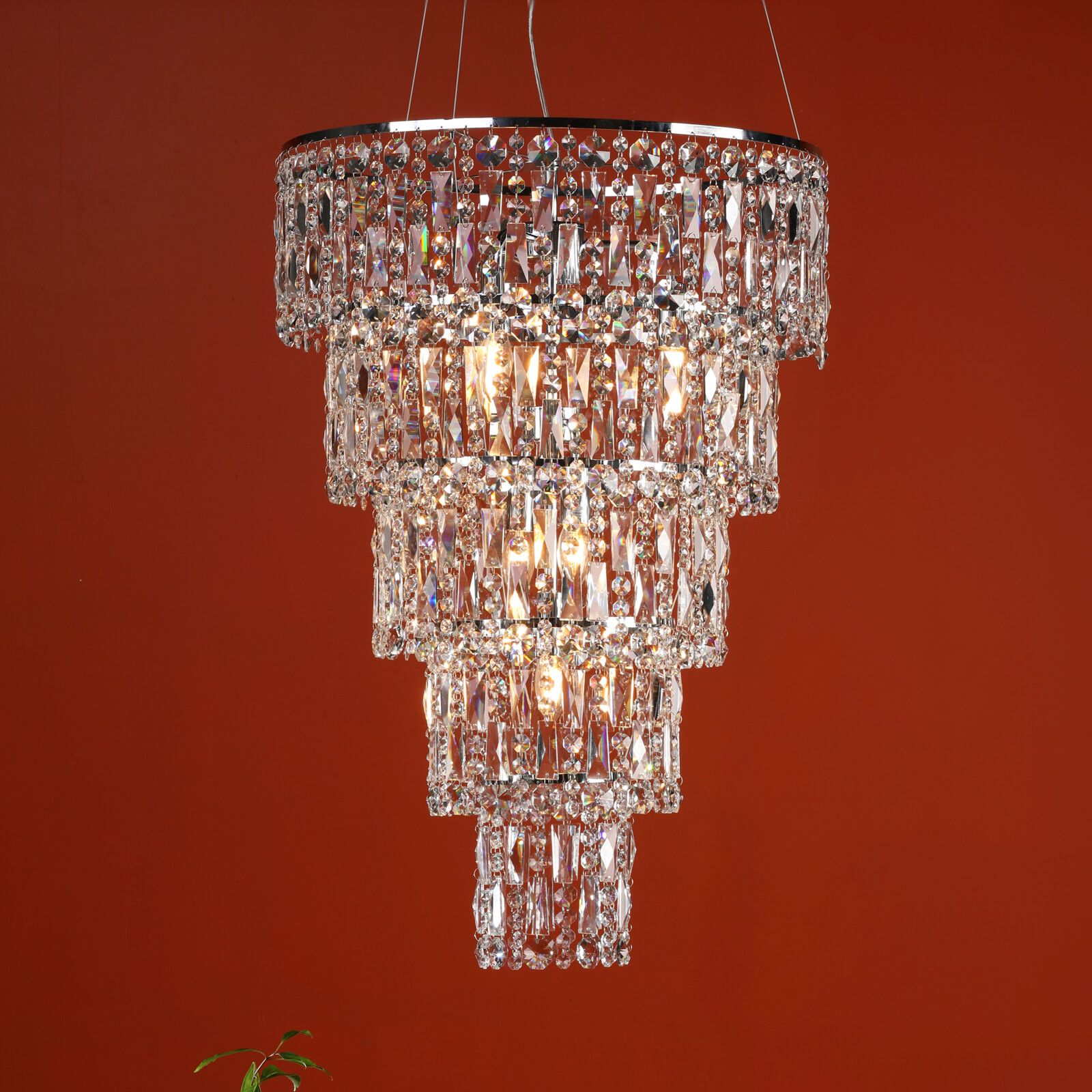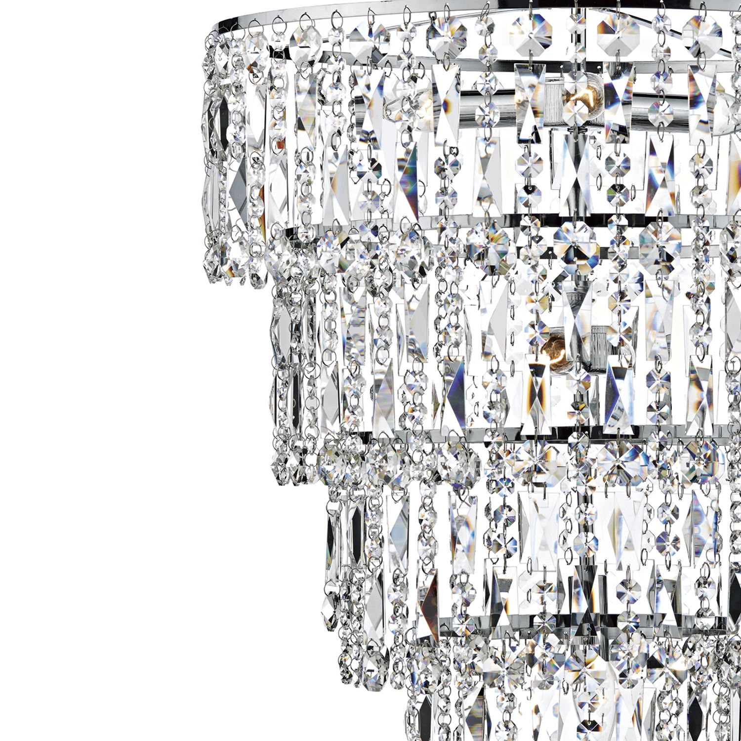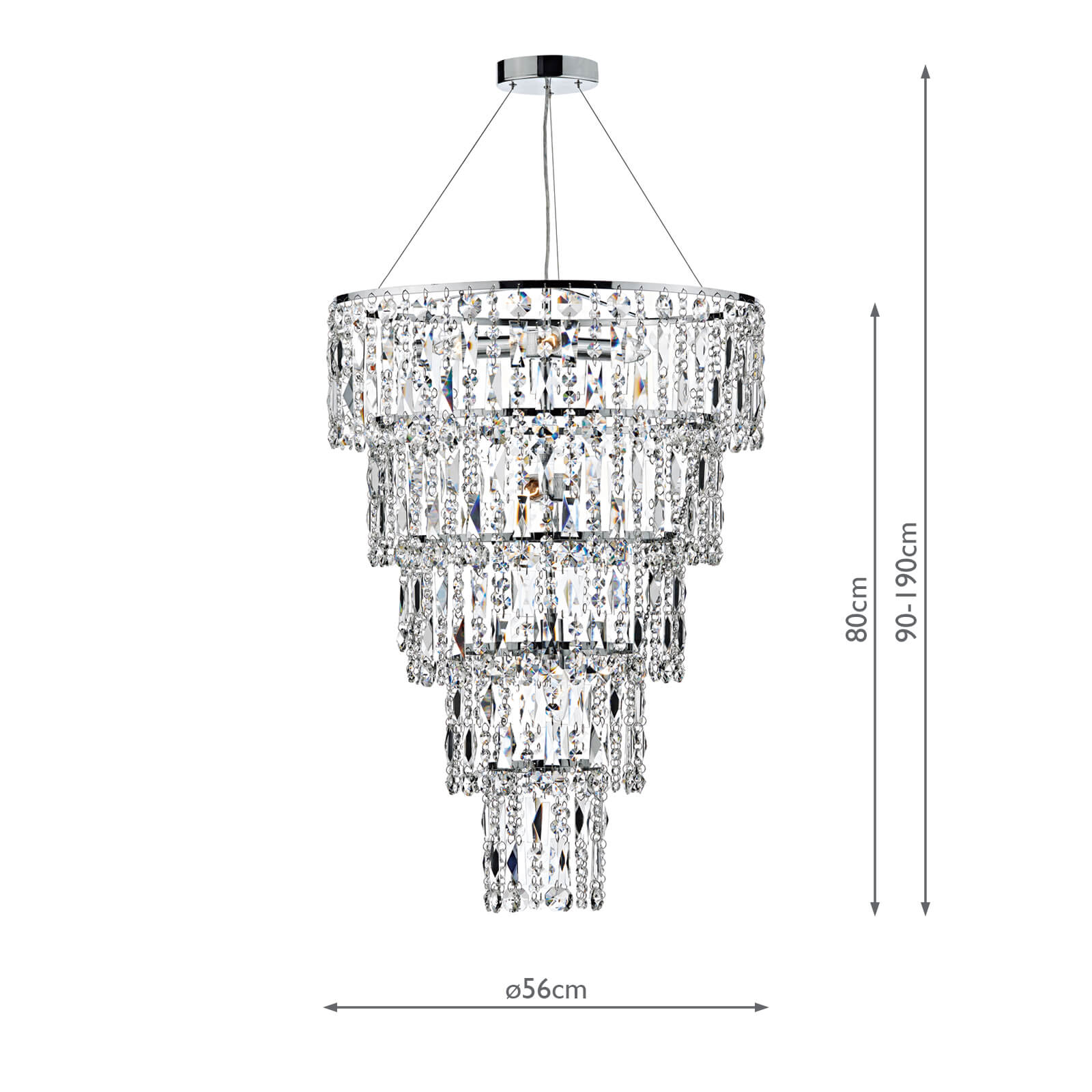 Luxury glass crystal pieces arranged on a polished chrome frame in 5 tiers for a waterfall effect. With 6 SES lamp holders this fitting is suitable for retro fit LED lamps. Height adjustable on installation and supplied with 1 meter of cable.